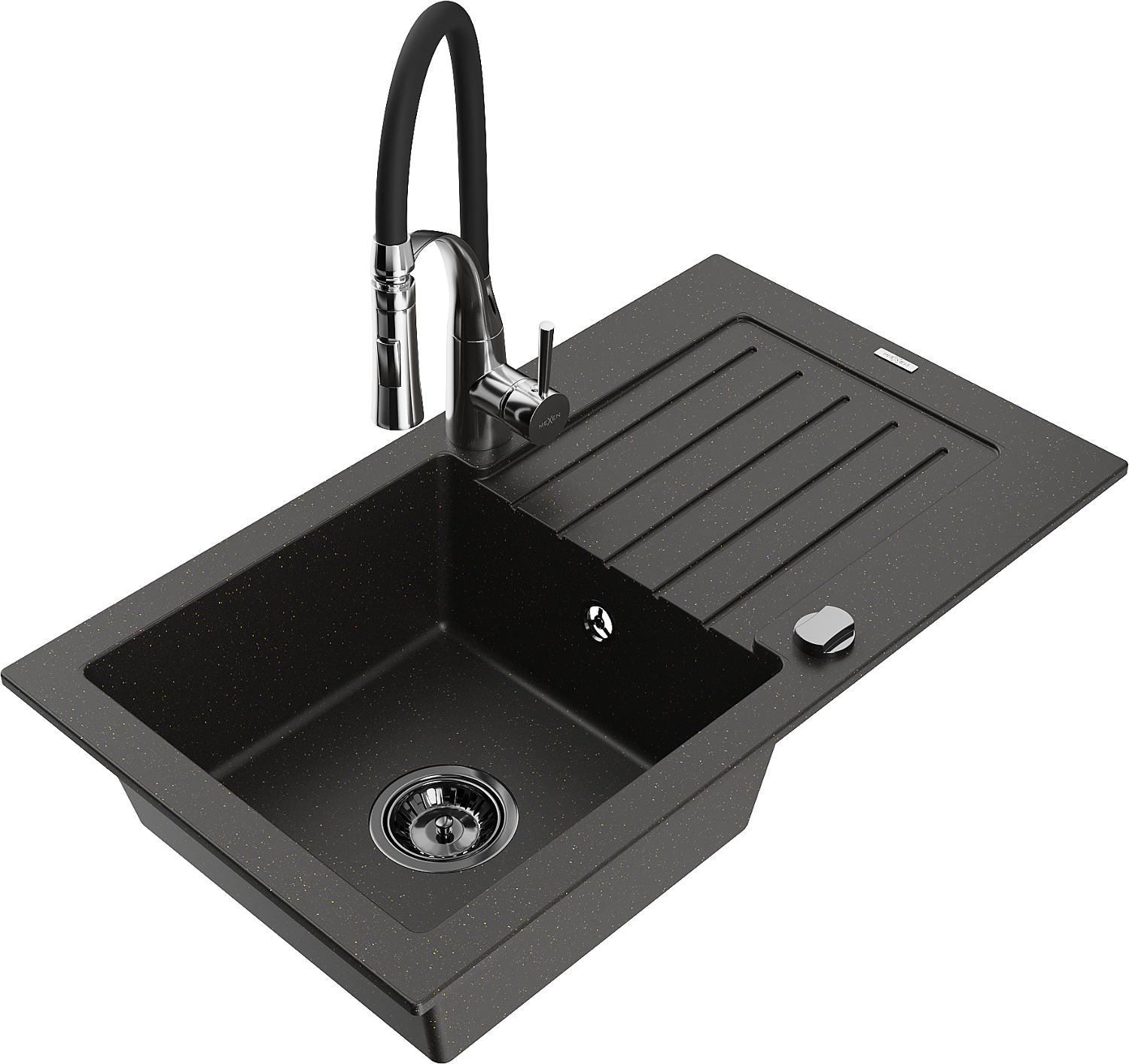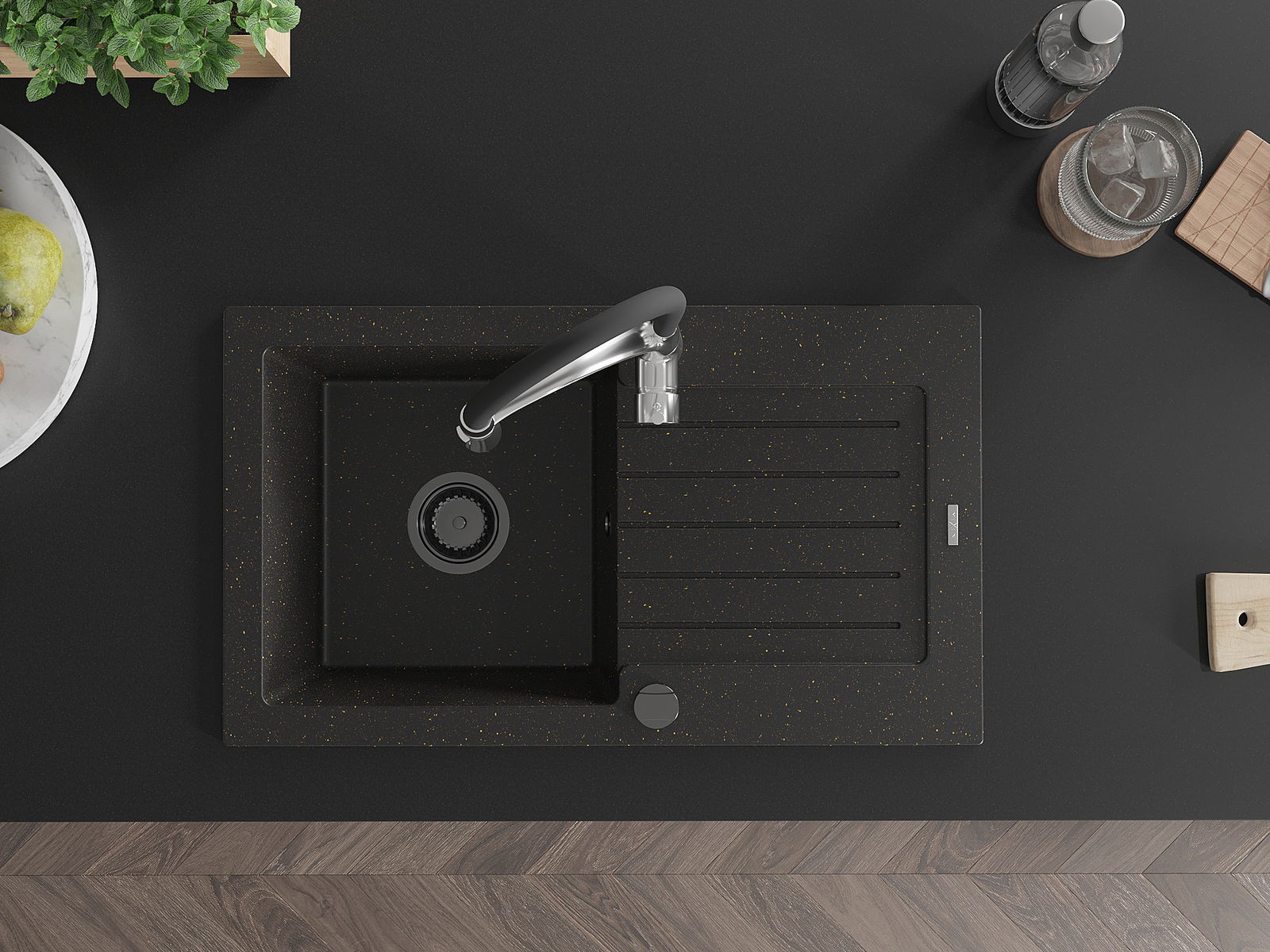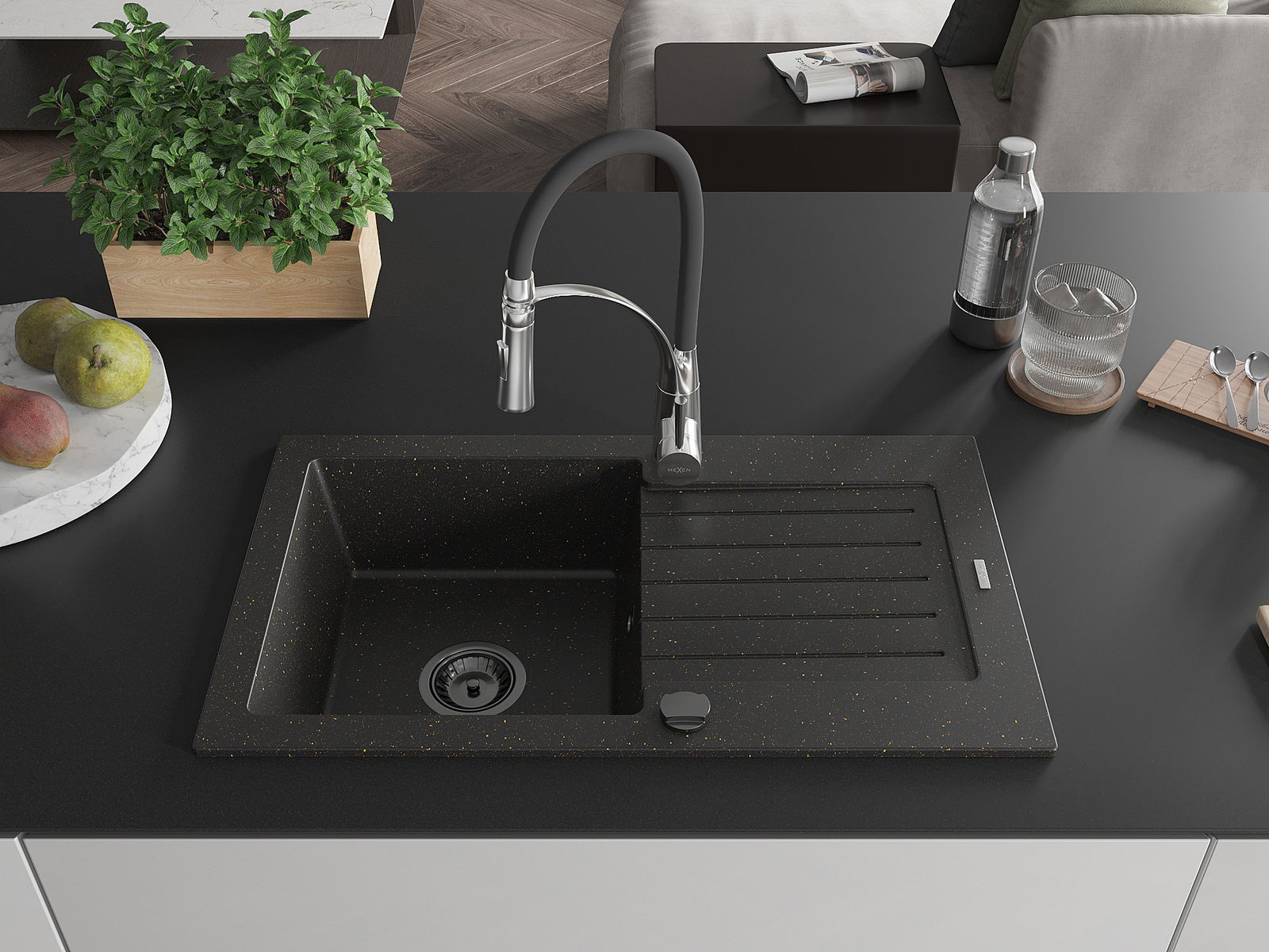Mexen Pablo granitinė 1 kamerų virtuvės kriauklė su nusausintuvu ir virtuviniu maišytuvu Aster, juodas/auksinis metalikas
