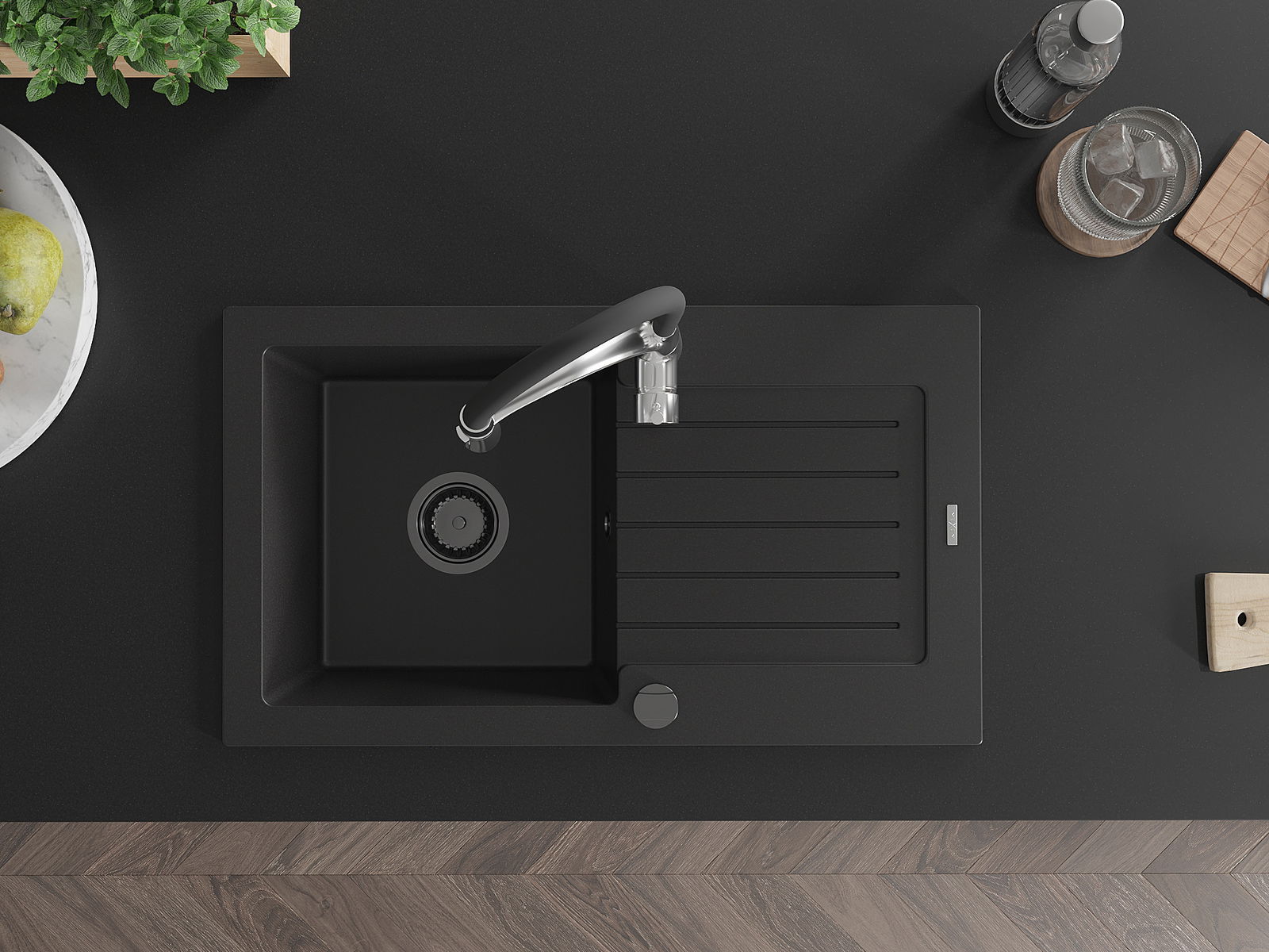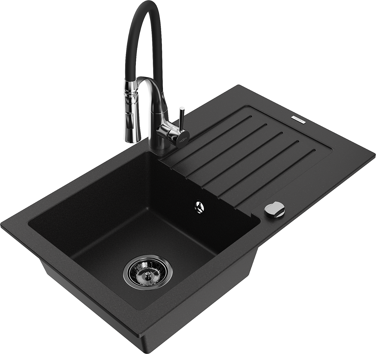 Mexen Pablo vienos dubens granitinė plautuvė su drenažu ir virtuviniu maišytuvu Aster, juoda - 6510-77-73450-07-B