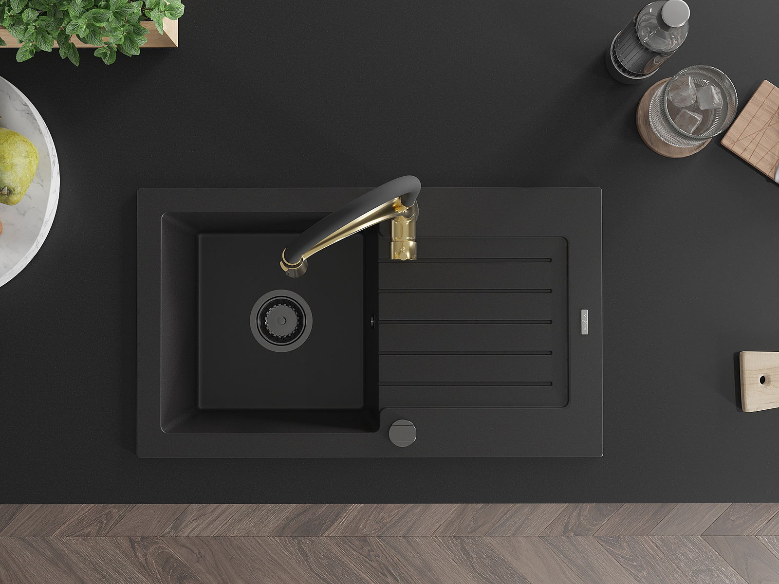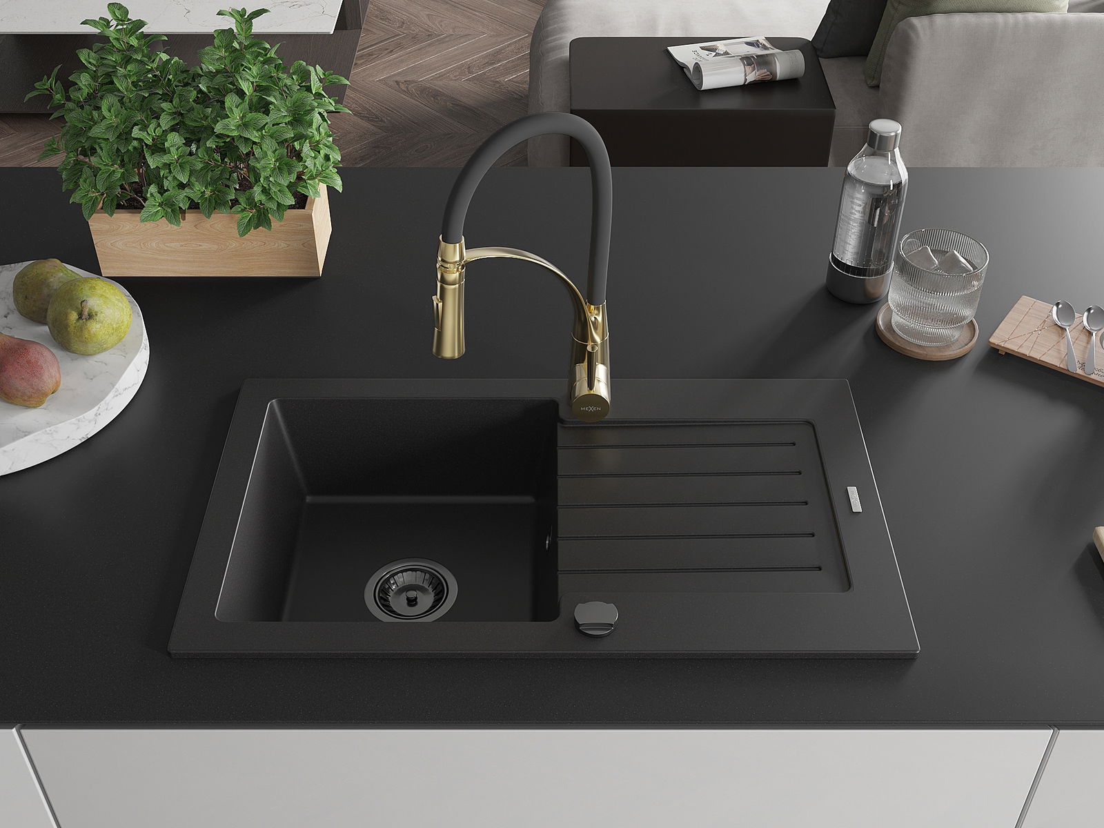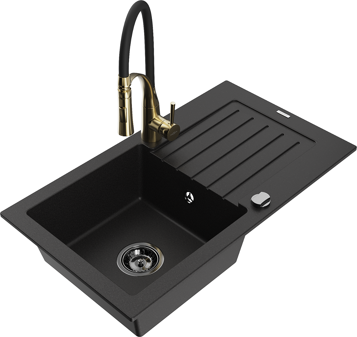 Mexen Pablo vienkamerė granito plautuvė su nusausinimo skyriumi ir virtuvinės maišytuvu Aster, juoda - 6510-77-73450-57-B