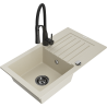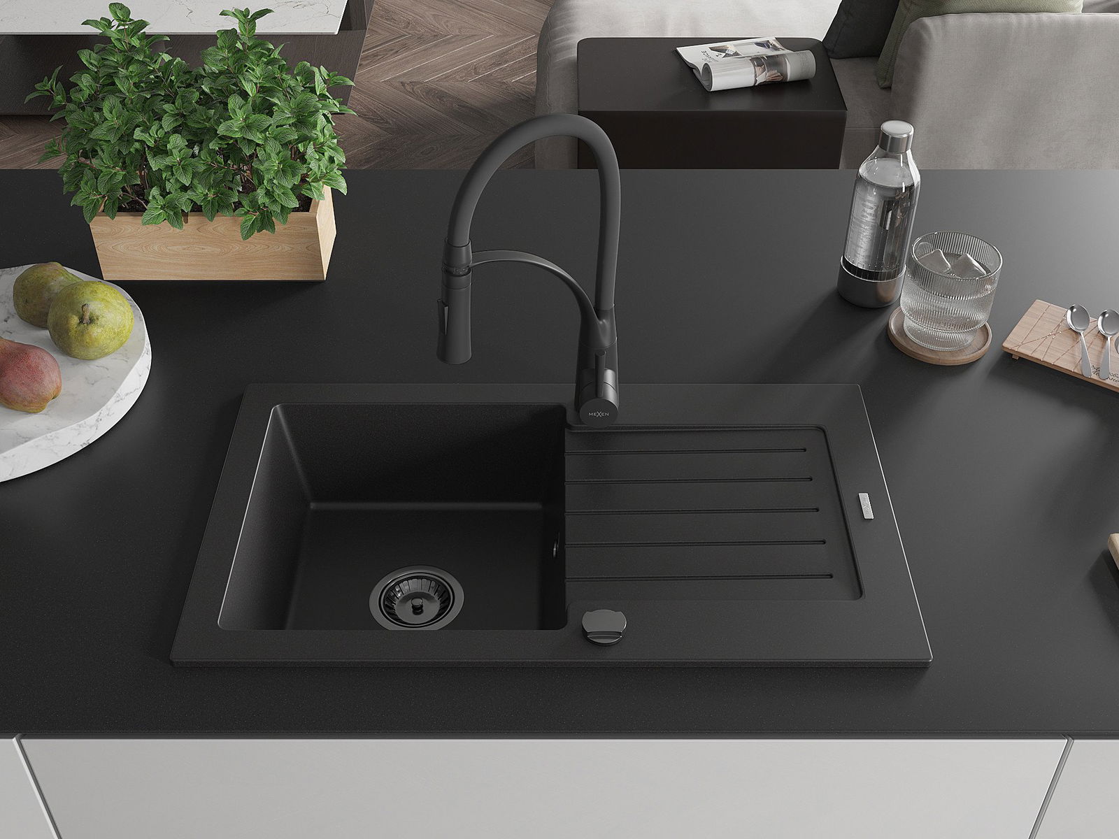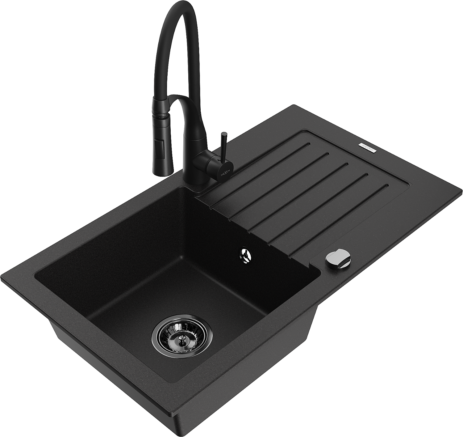 Mexen Pablo vienos kameros granitinė kriauklė su nutekamuoju paviršiumi ir virtuviniu maišytuvu Aster, juoda