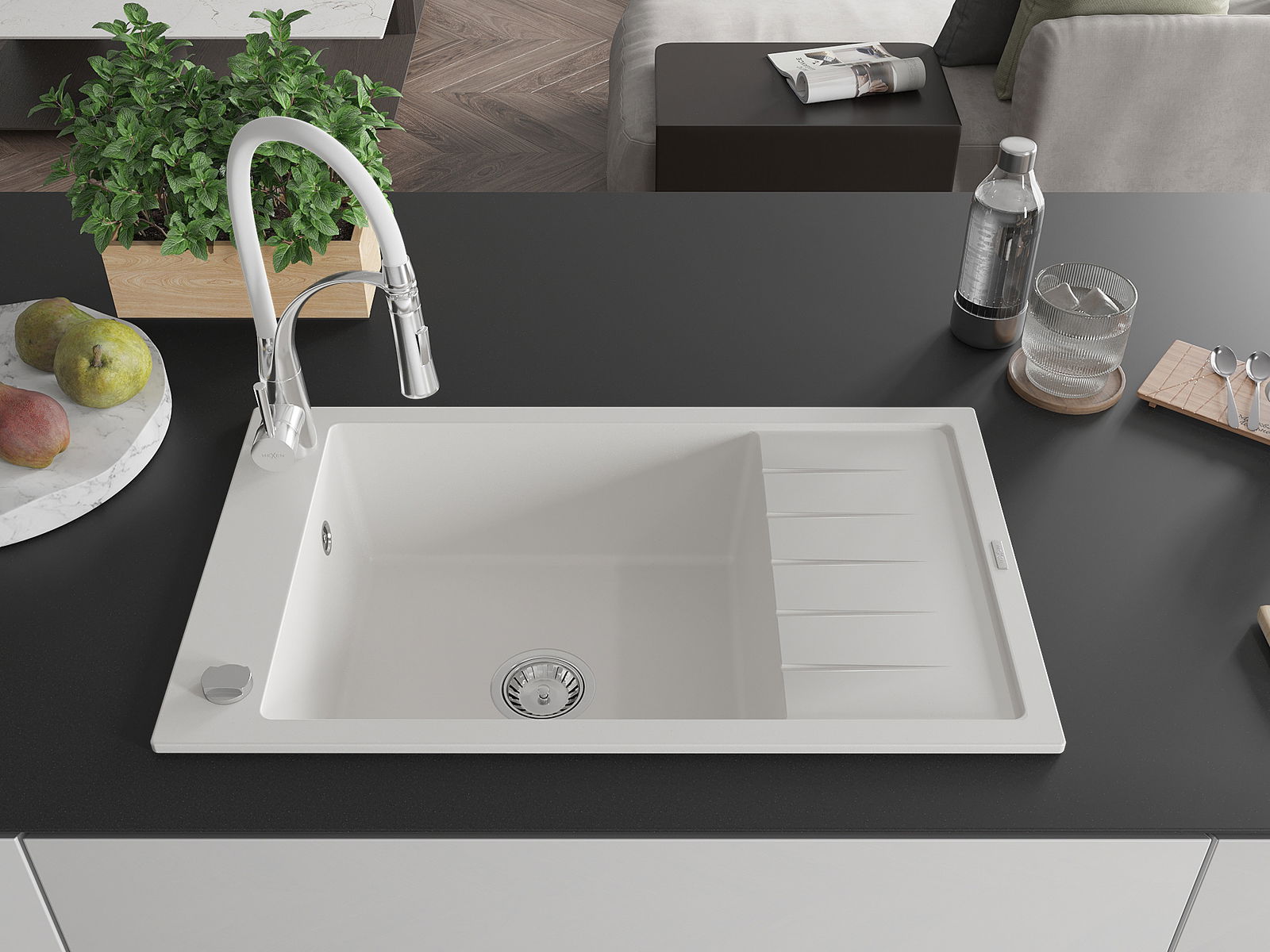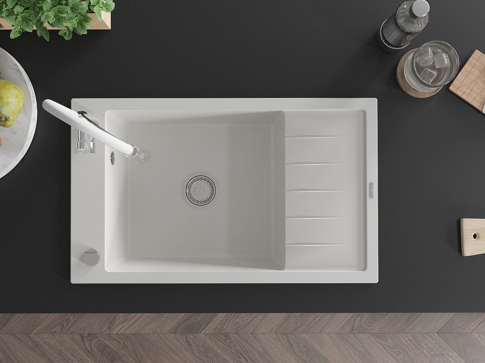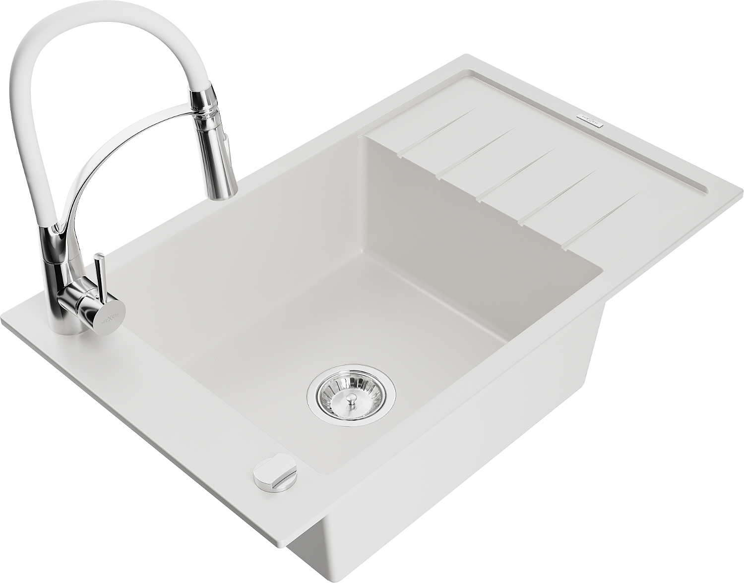 Mexen Elias granitinis vienos kameros virtuvės kriauklė su nusausintuvu ir virtuvės maišytuvu Aster, balta - 6511-20-73450-02