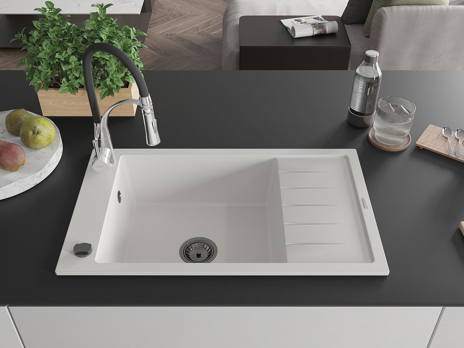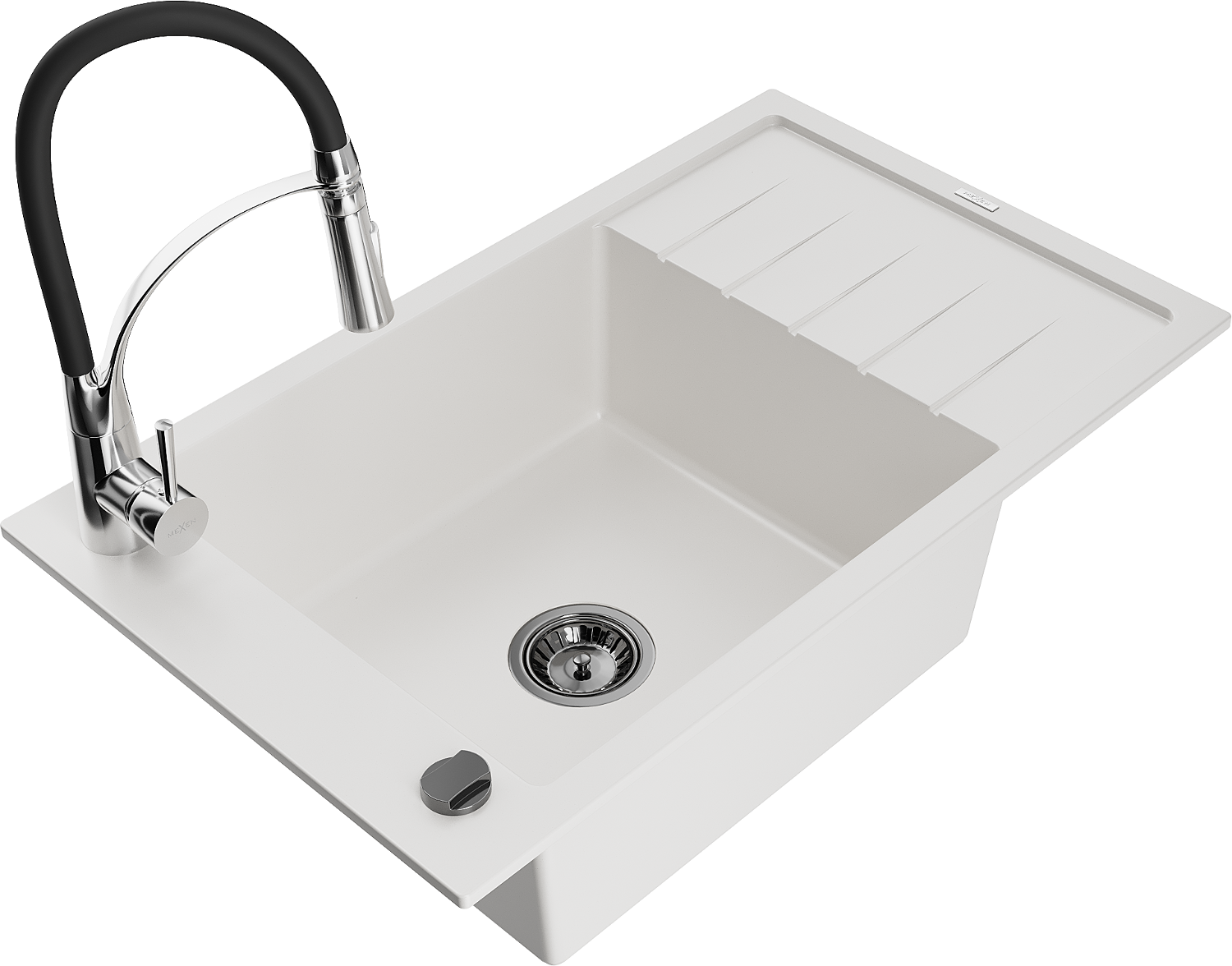 Mexen Elias 1-komorinis granitinis virtuvės kriauklė su nusausinimo vieta ir maišytuvu Aster, baltas - 6511-20-73450-07-B