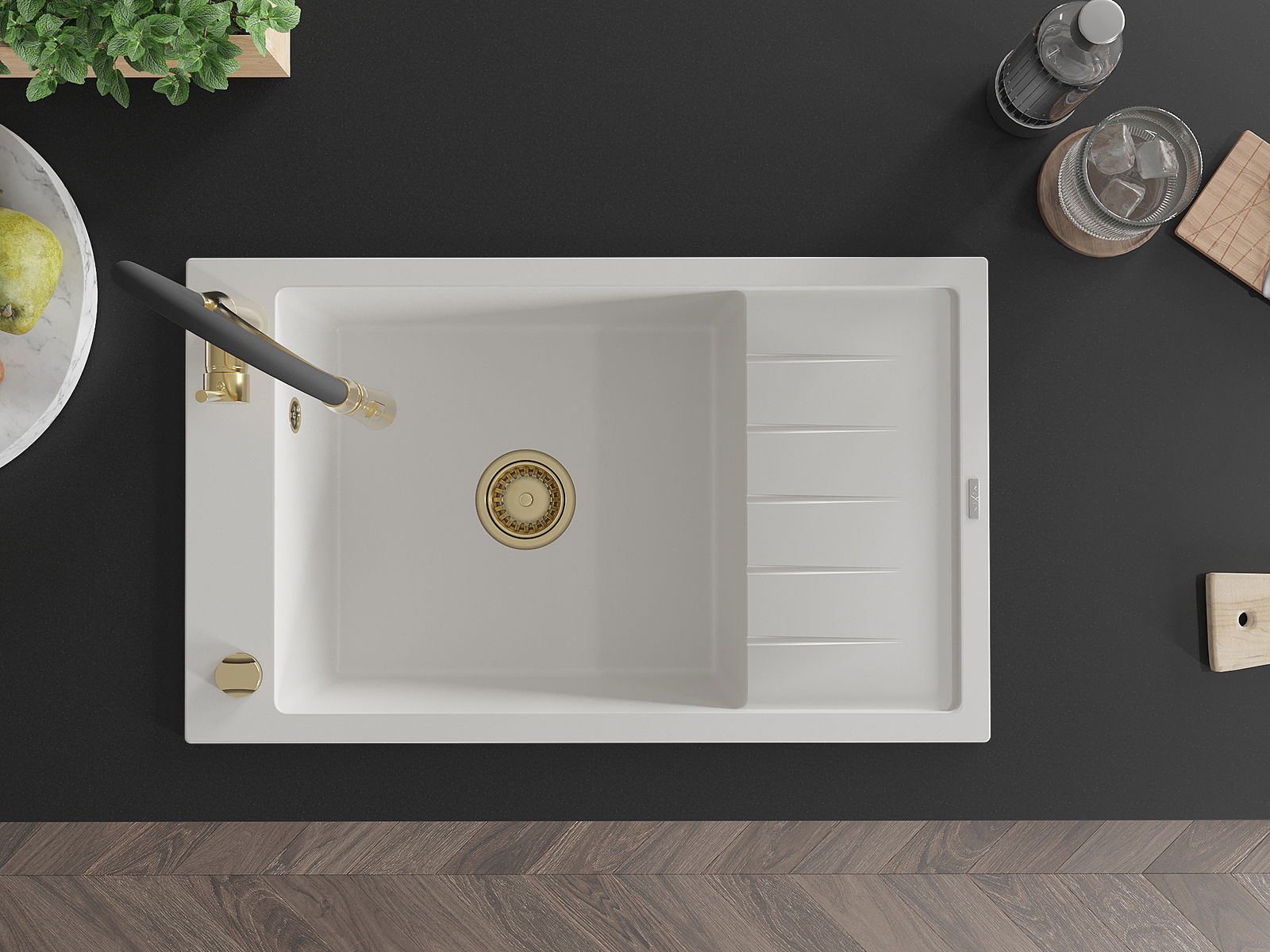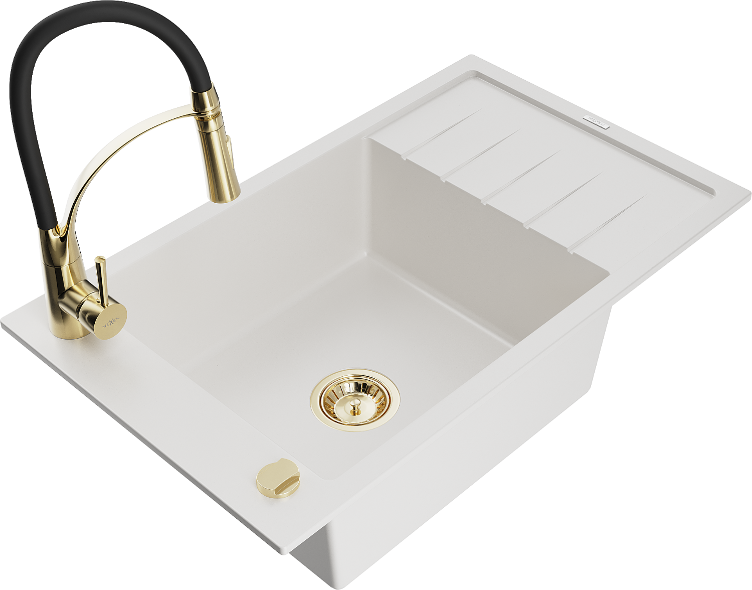 Mexen Elias granito virtuvės kriauklė su viena kamera, drenažu ir virtuviniu maišytuvu Aster, balta - 6511-20-73450-57-G