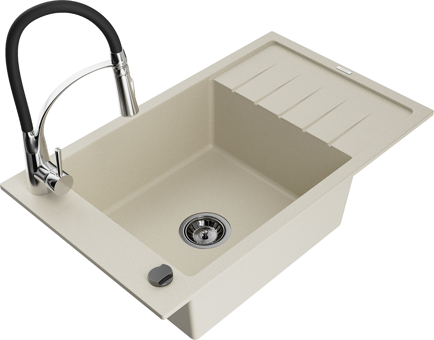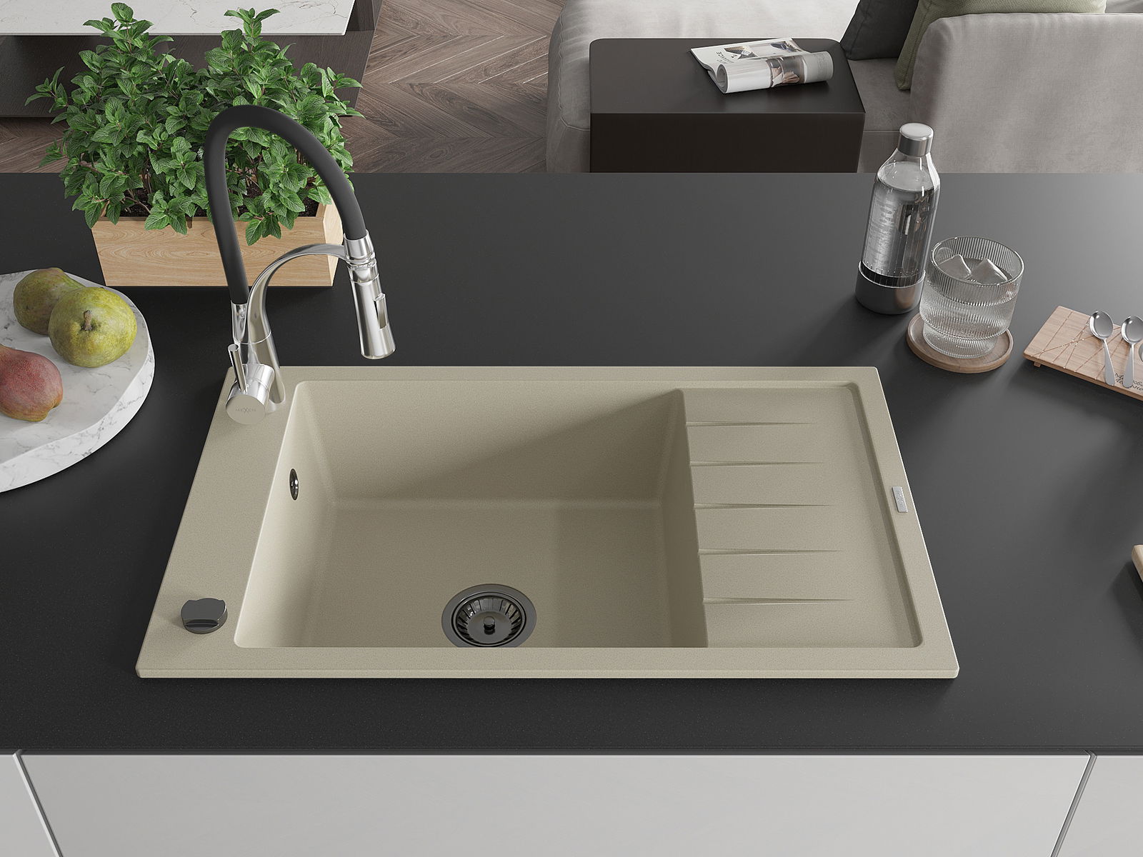 Mexen Elias vienos kameros granito kriauklė su nutekėtu ir virtuvės maišytuvu Aster, smėlio - 6511-69-73450-07-B