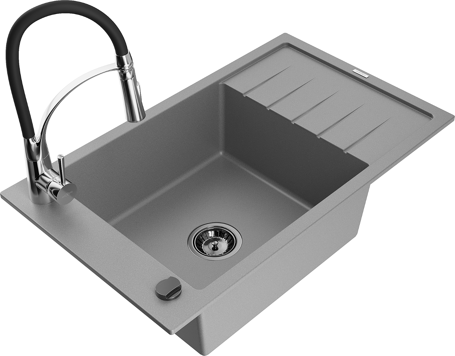 Mexen Elias granitinė virtuvinė kriauklė su 1 dubeniu ir lašintuvu bei Aster virtuviniu maišytuvu, pilka - 6511-71-73450-07-B