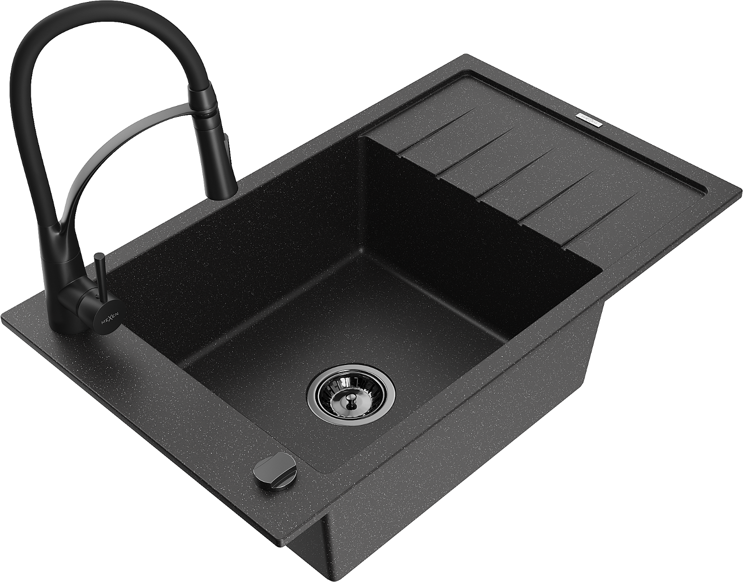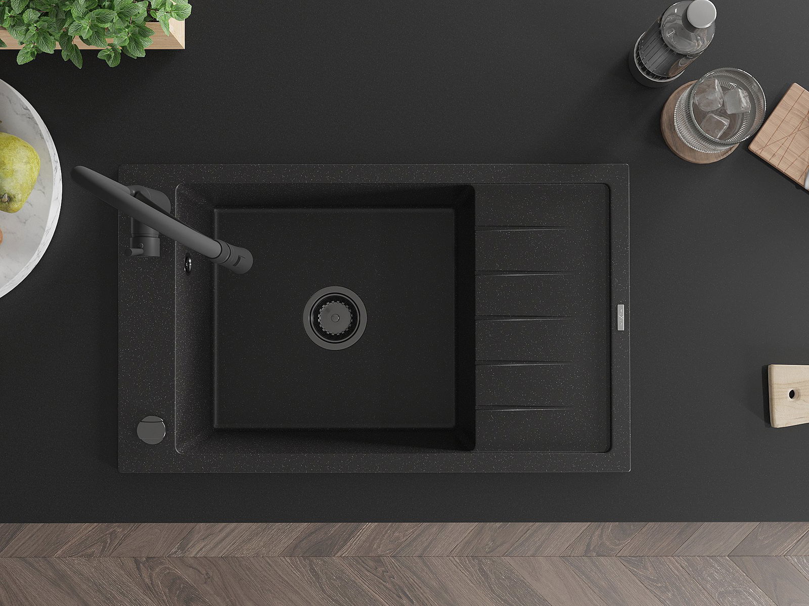 Mexen Elias granitinė vienos kameros plautuvė su nutekamuoju paviršiumi ir virtuviniu maišytuvu Aster, juoda/sidabrinis