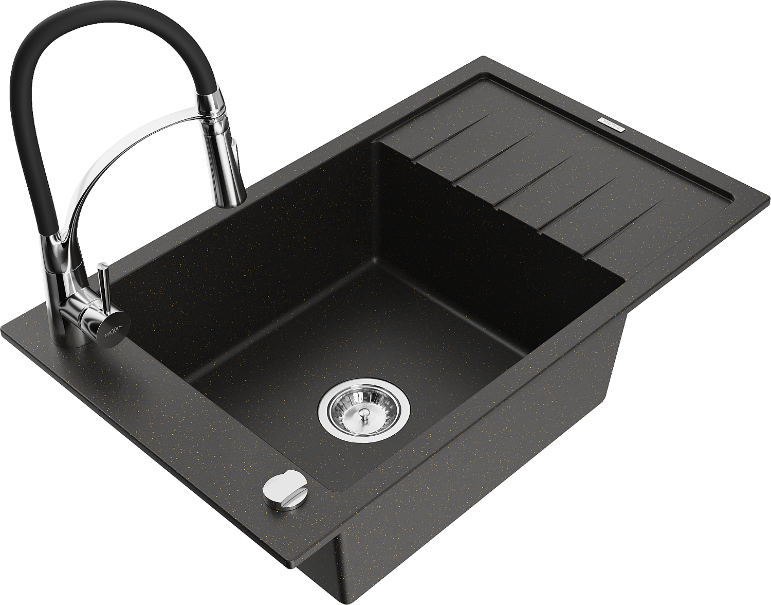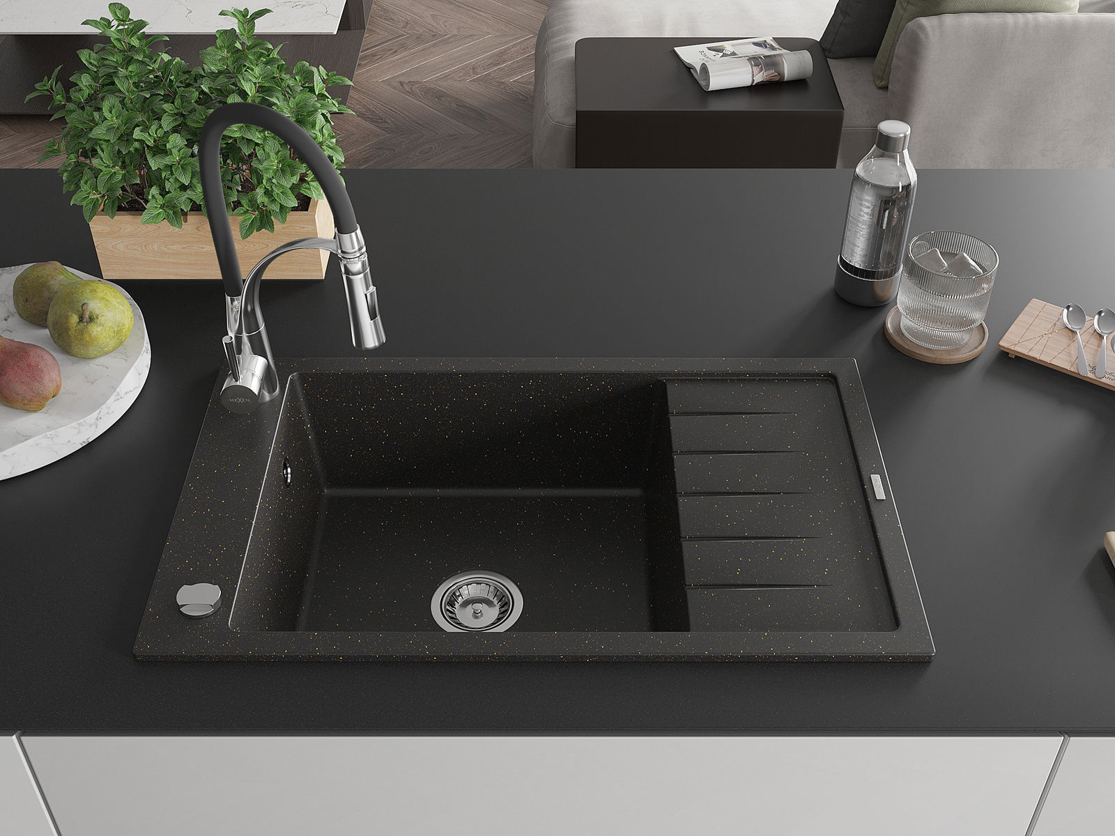Mexen Elias granitinė viena dubens kriauklė su nutekamu ir virtuviniu maišytuvu Aster, juoda/auksinė metalo spalva
