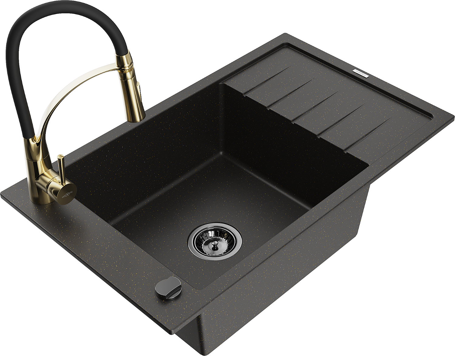 Mexen Elias granitinis vienos kameros plautuvė su nusausinimo vieta ir virtuviniu maišytuvu Aster, juoda/auksinė metalika - 651?