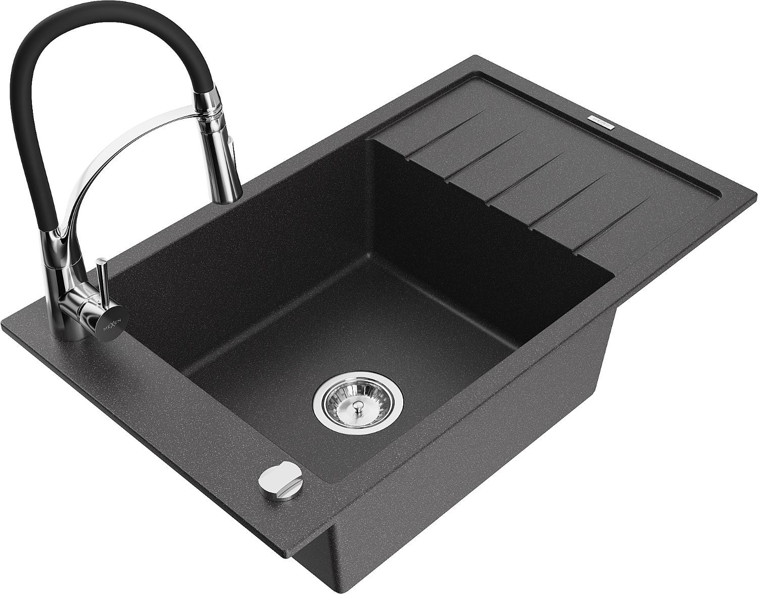 Mexen Elias granitinė vienos plautuvės kriauklė su nutekamuoju paviršiumi ir virtuviniu maišytuvu Aster, juodas dėmėtas - 6511-?