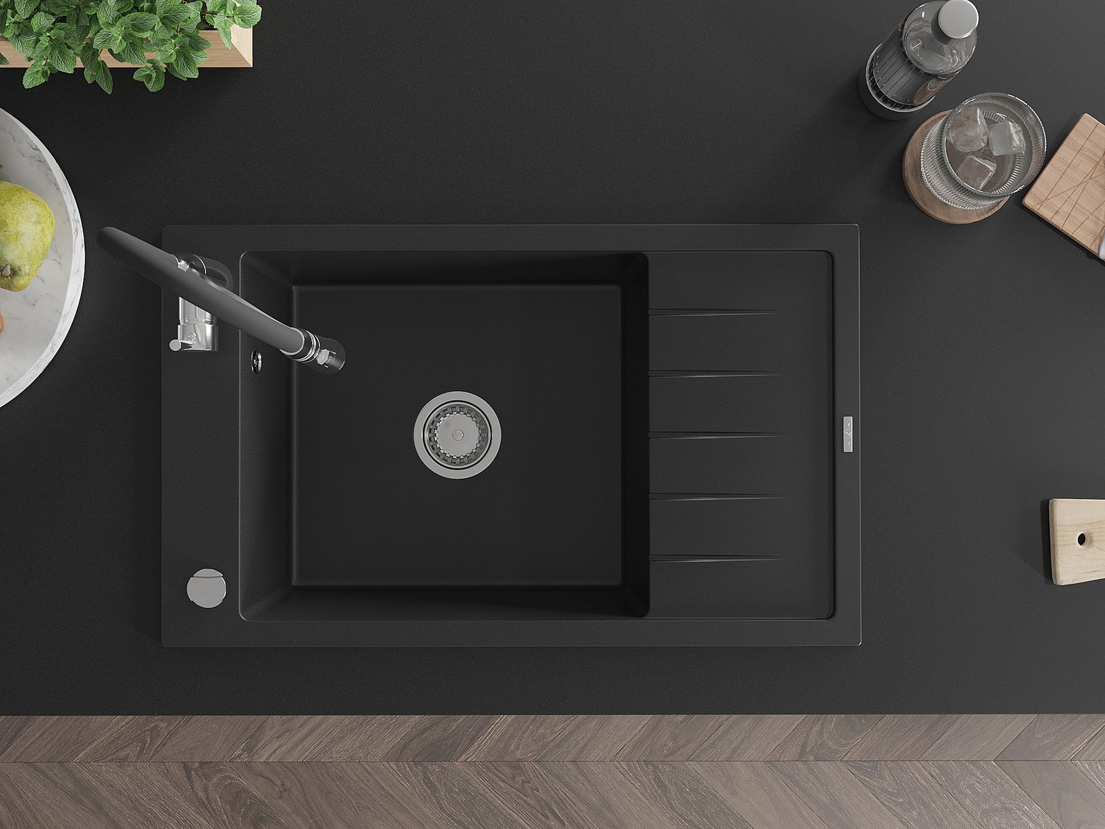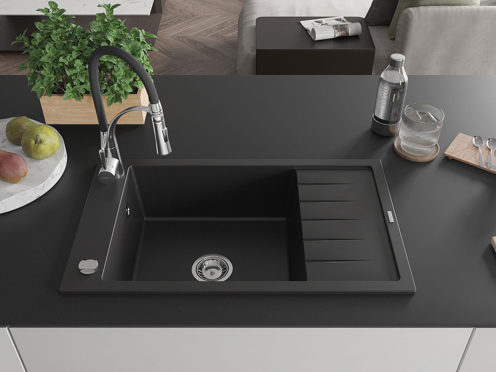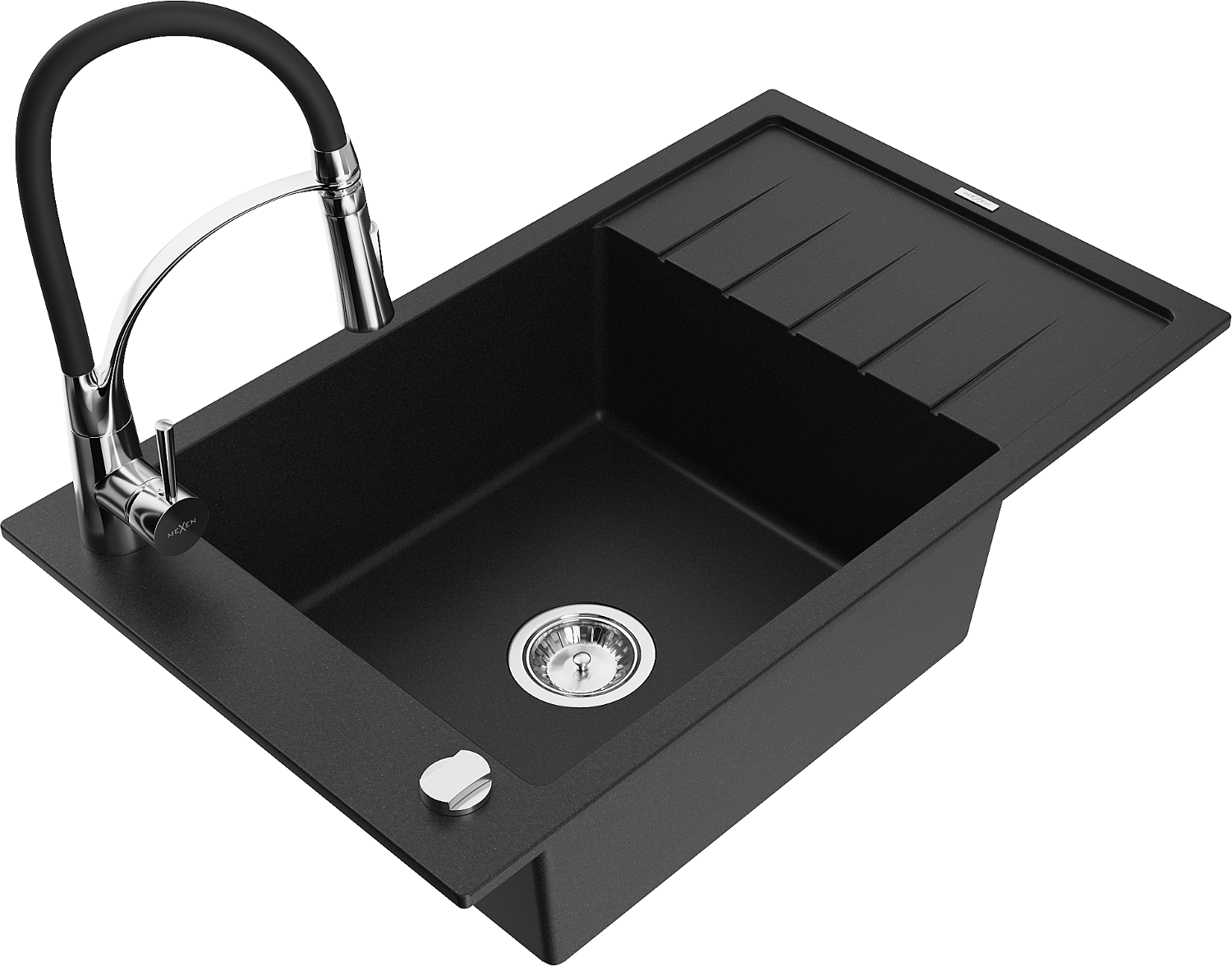 Mexen Elias 1-dubeninė granitinė kriauklė su nusausintuvu ir virtuvės maišytuvu Aster, juodas - 6511-77-73450-07