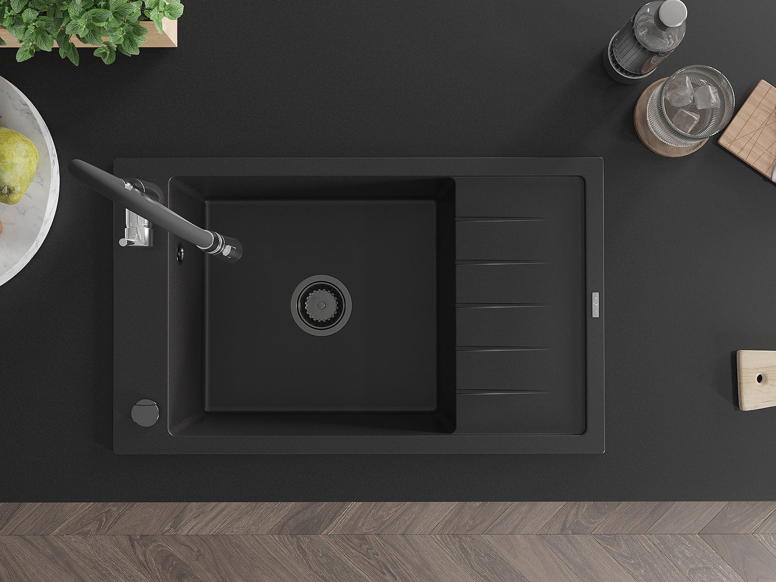 Mexen Elias granitinė vienos kameros plautuvė su nuvarvėtu ir virtuviniu maišytuvu Aster, juoda - 6511-77-73450-07-B