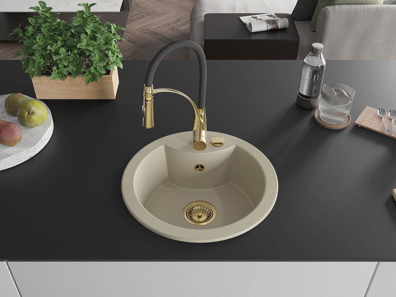 Mexen Diego granitinis vienos komoros plautuvė su virtuviniu maišytuvu Aster, smėlio spalvos - 6512-69-73450-57-G