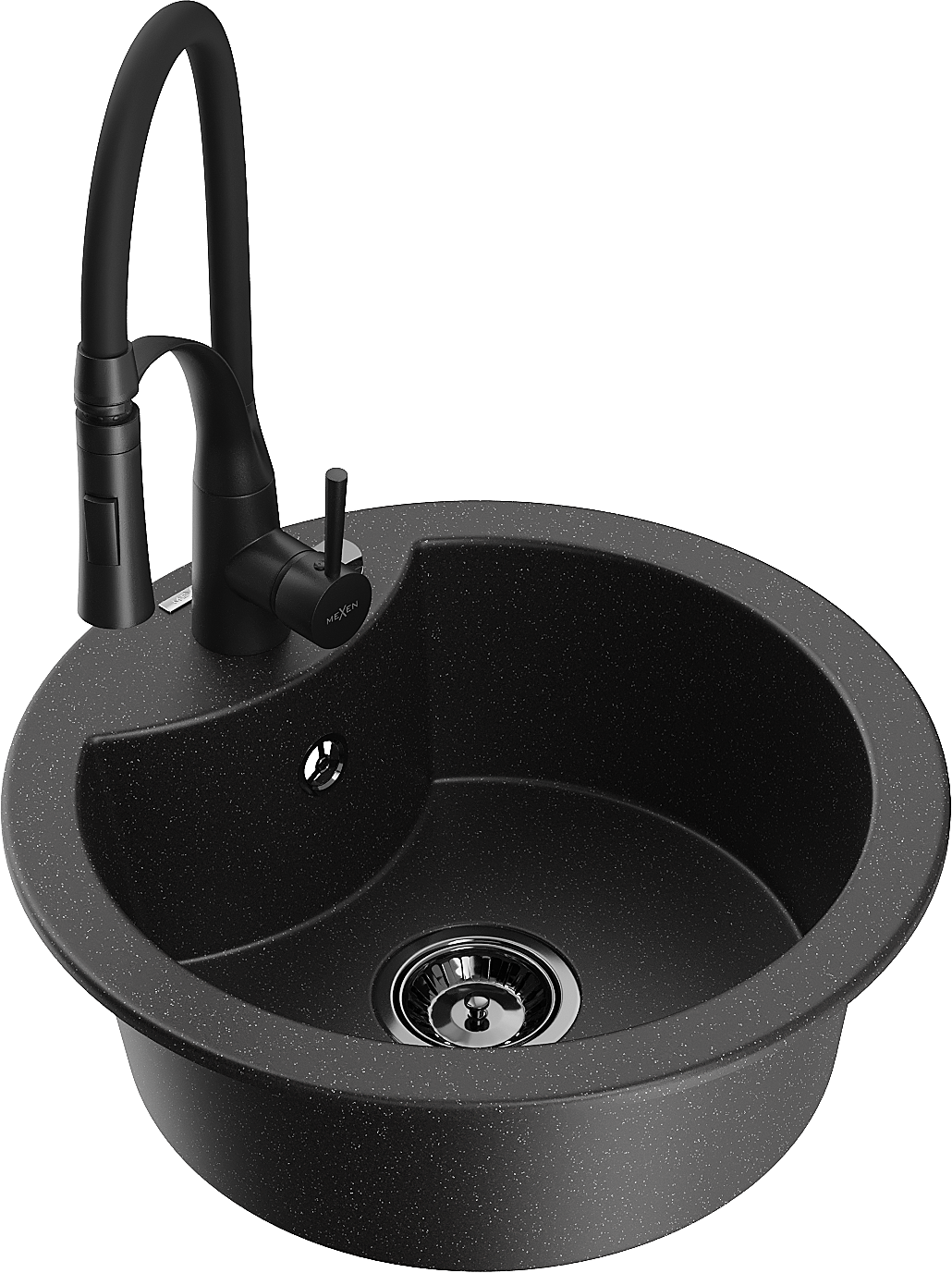 Mexen Diego granito plautuvė 1-dubenėlio su virtuviniu maišytuvu Aster, juoda/sidabrinis metalikas - 6512-73-73450-70-B