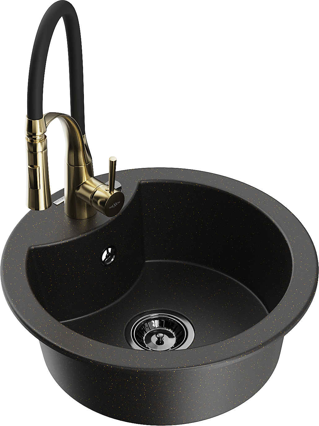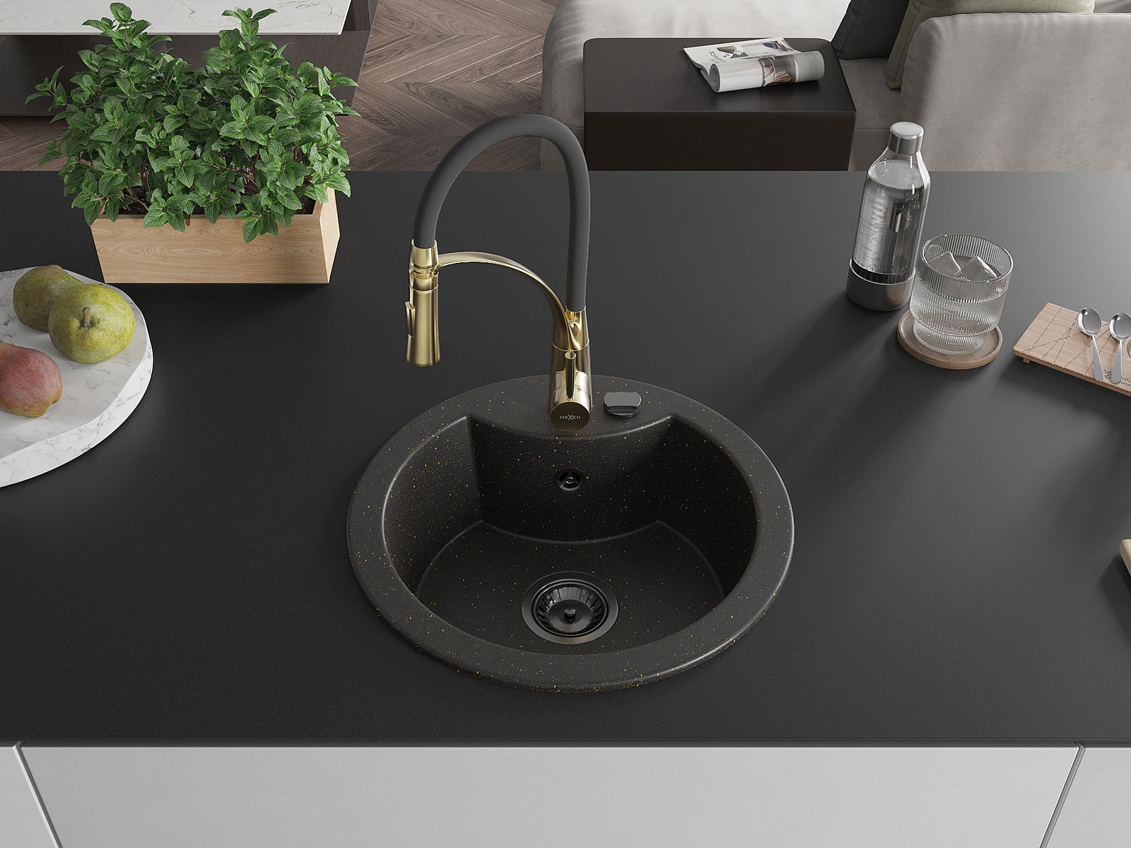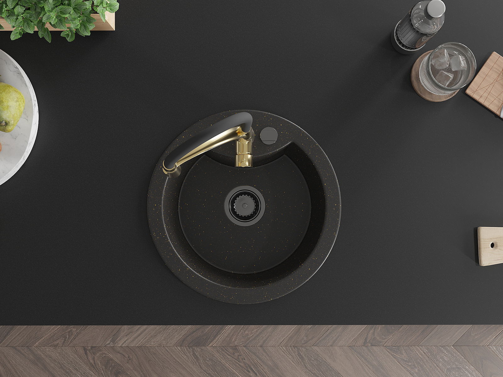 Mexen Diego granitinė plautuvė su viena kamera ir virtuviniu maišytuvu Aster, juoda/auksinė metaliko spalva