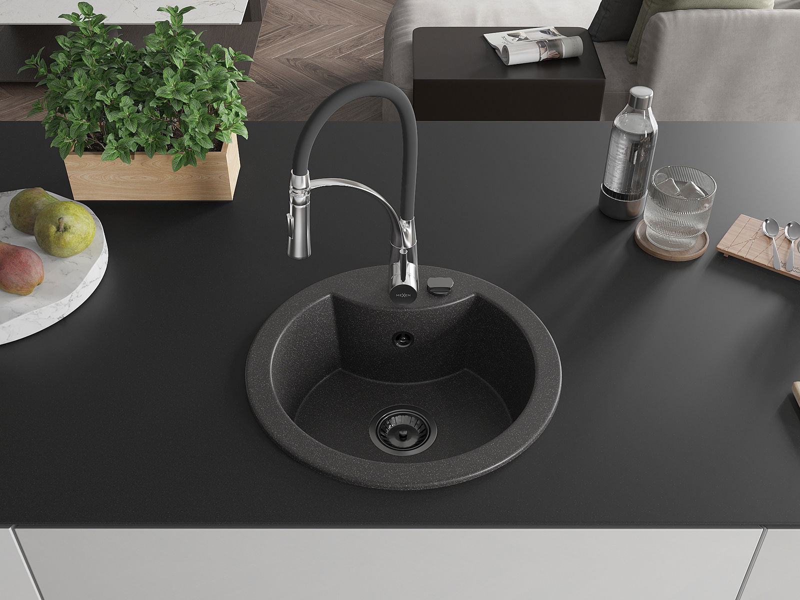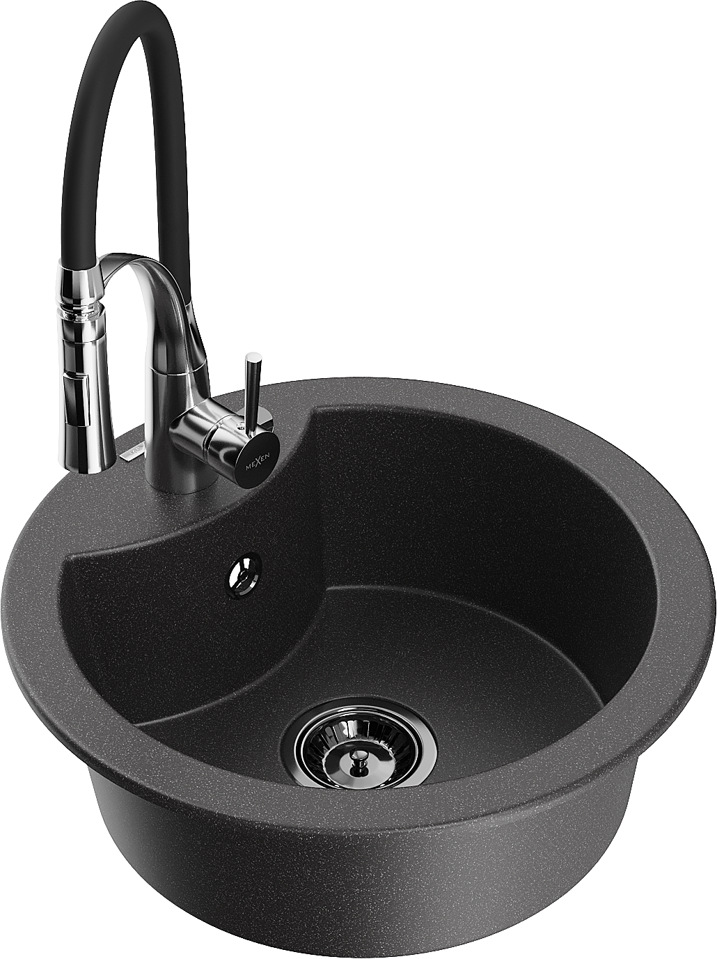 Mexen Diego granitinis virtuvės plautuvas su 1 skyriumi ir virtuviniu maišytuvu Aster, juodas su dėmėmis - 6512-76-73450-07-B