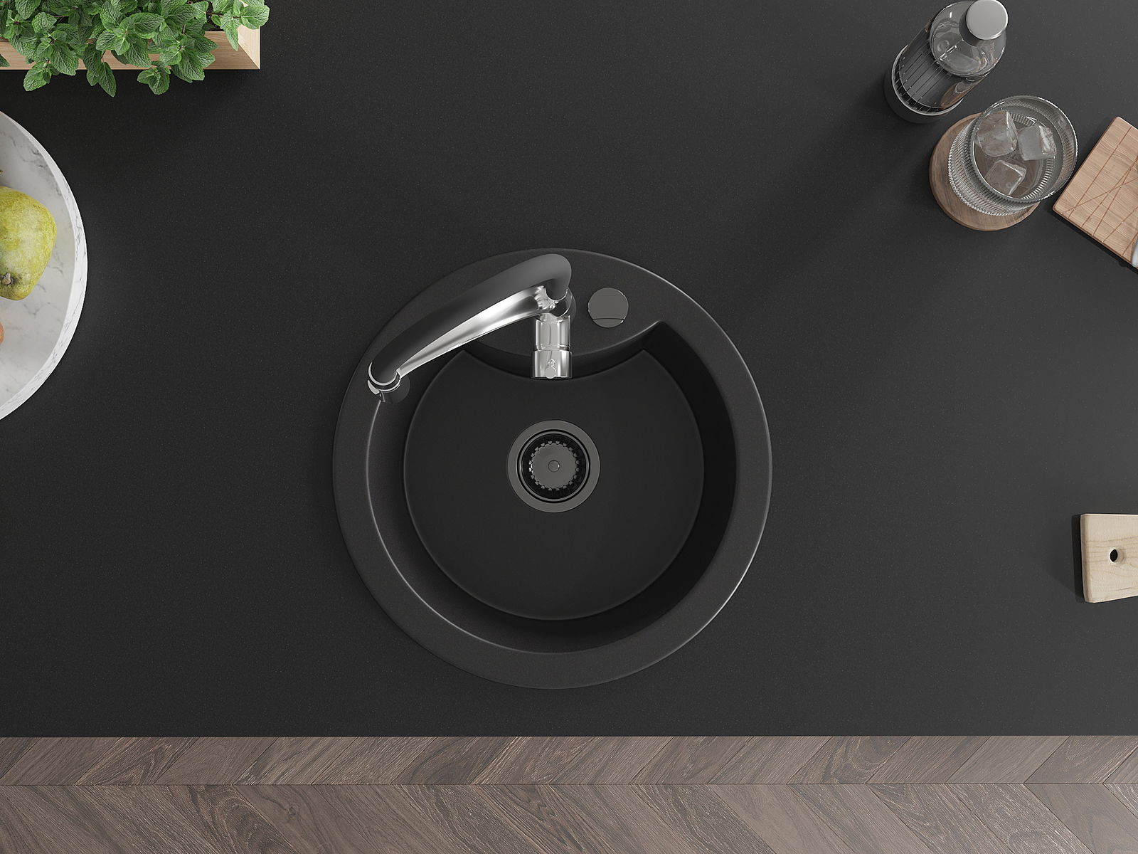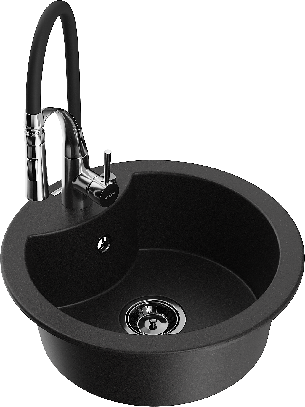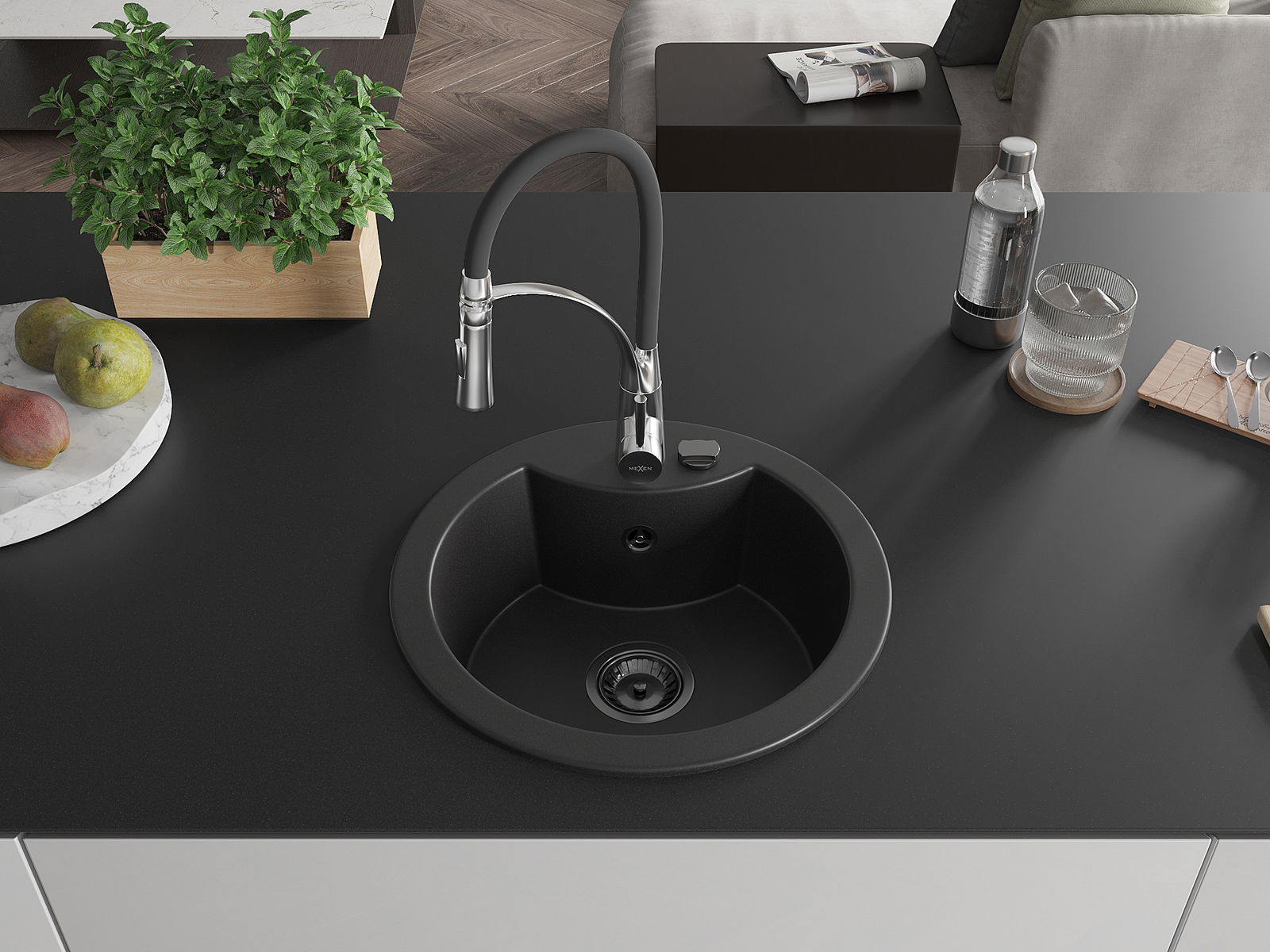 Mexen Diego vienos kameros granitinė kriauklė su virtuviniu maišytuvu Aster, juoda - 6512-77-73450-07-B