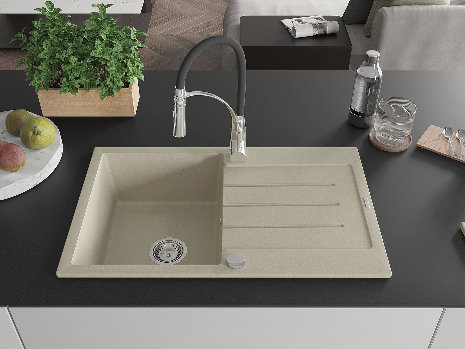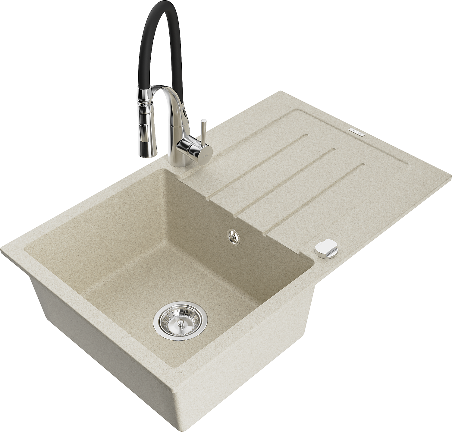 Mexen Bruno granitinė vieno dubens kriauklė su nuvarvėjimo zona ir virtuviniu maišytuvu Aster, smėlio spalvos