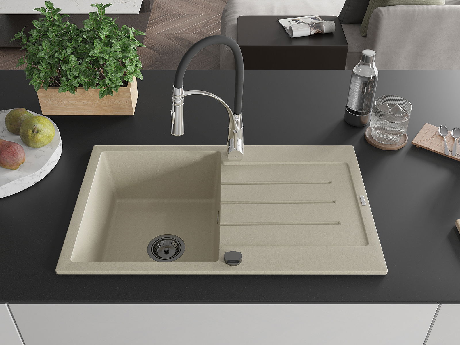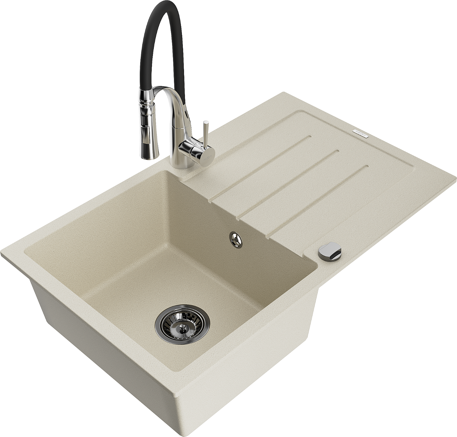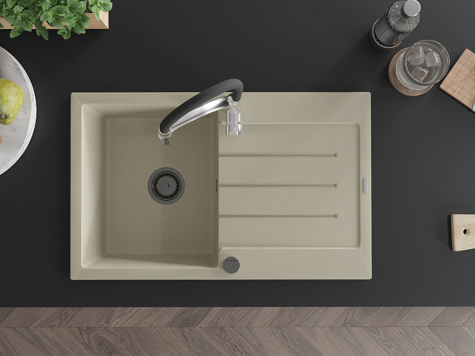Mexen Bruno vienos plautuvės granitinė kriauklė su nusausinimo plokšte ir virtuvės maišytuvu Aster, smėlio - 6513-69-73450-07-B