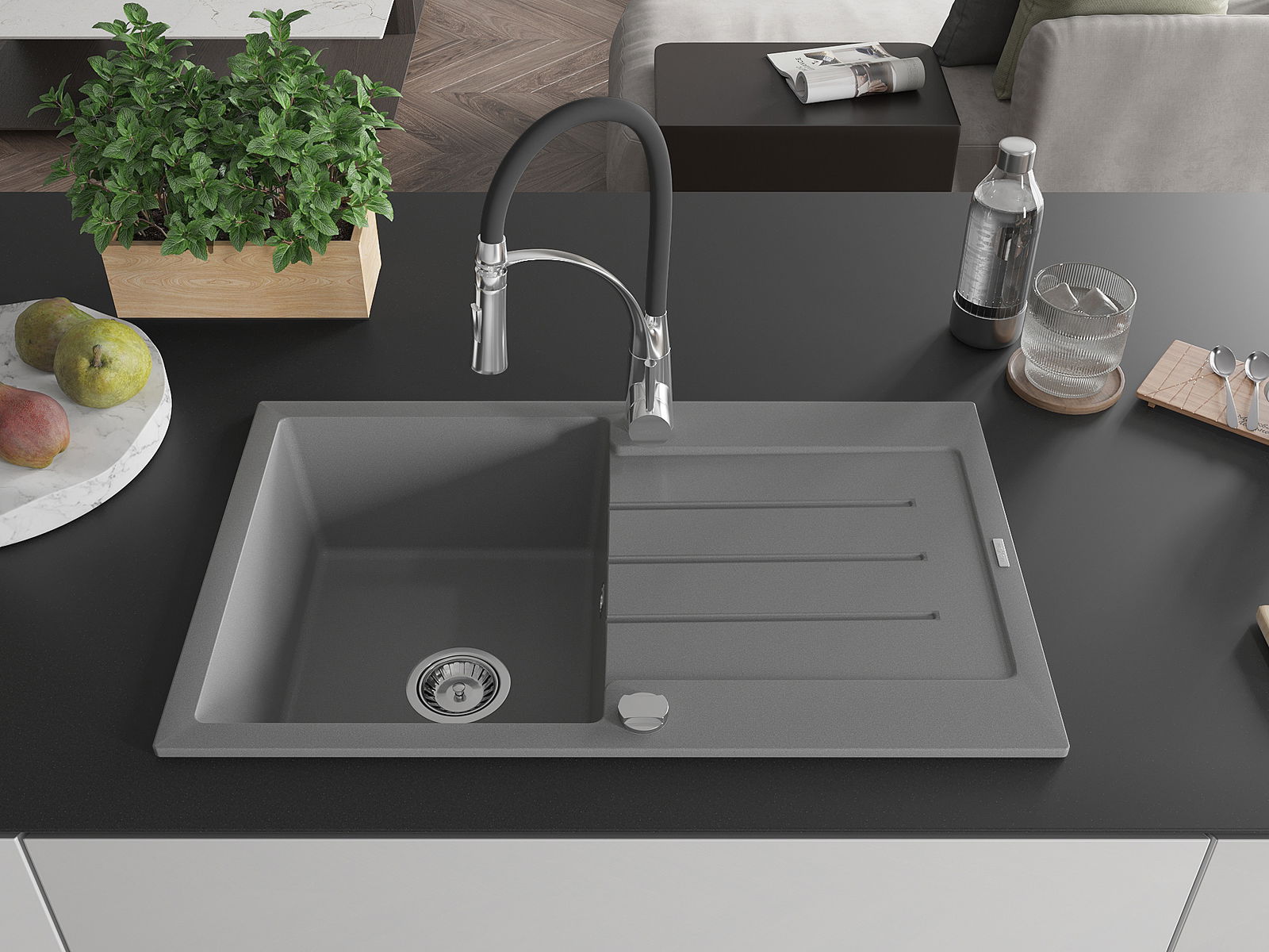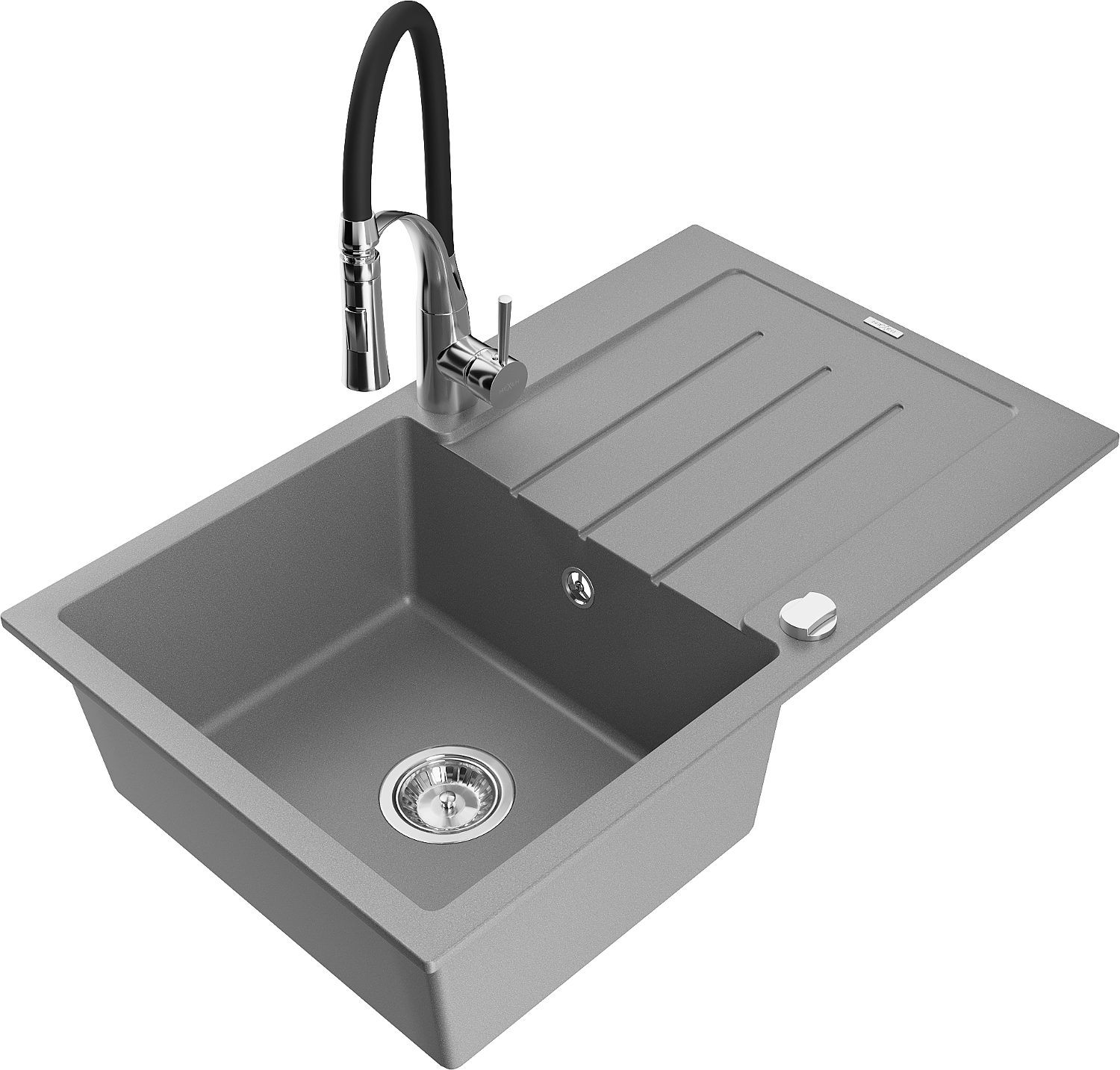 Mexen Bruno granitinė vienos kameros plautuvė su nusausintuvu ir virtuviniu maišytuvu Aster, pilkos spalvos
