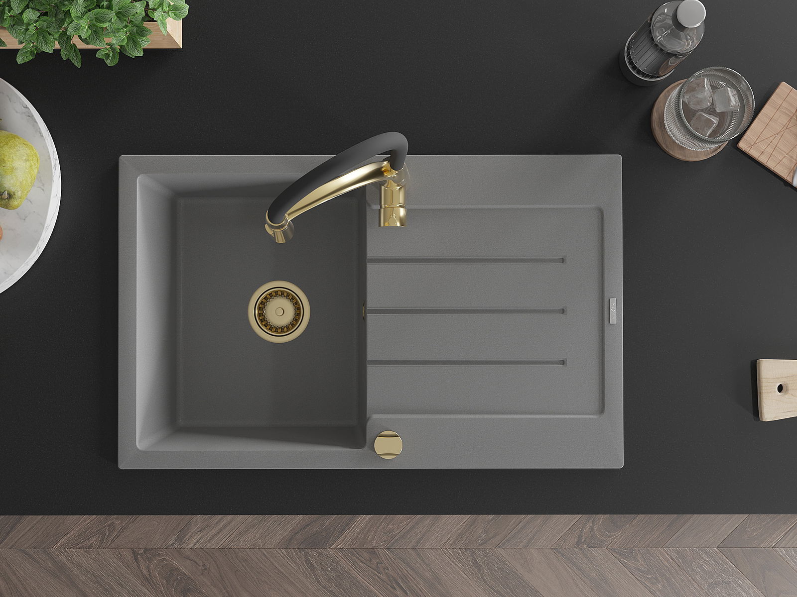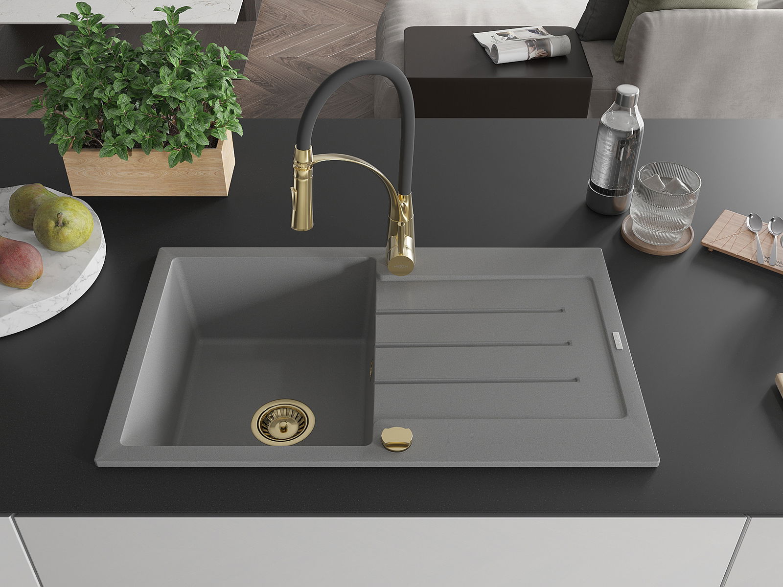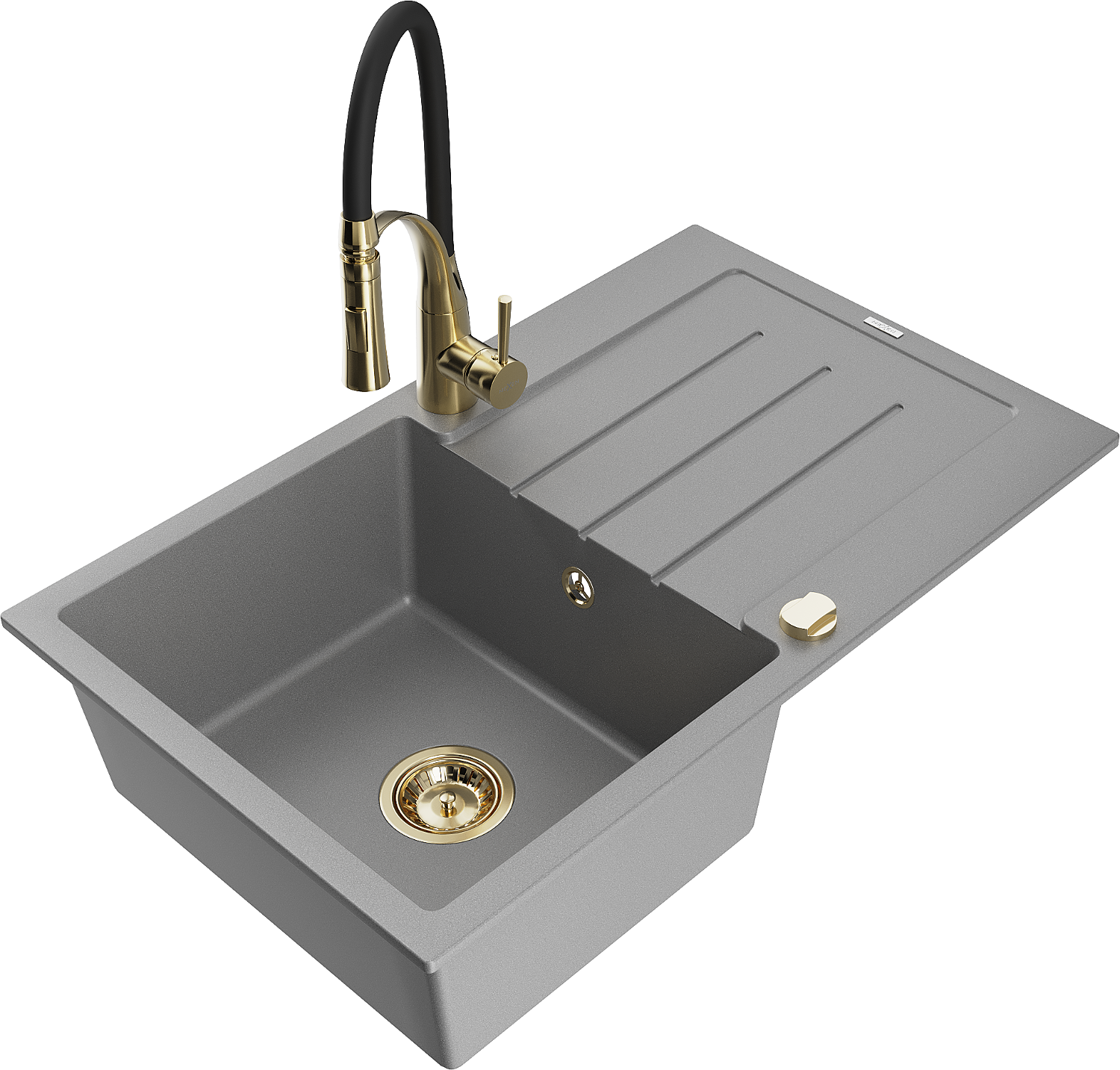 Mexen Bruno vienos kameros granitinė kriauklė su nuvarvēju ir virtuvės baterija Aster, pilka - 6513-71-73450-57-G