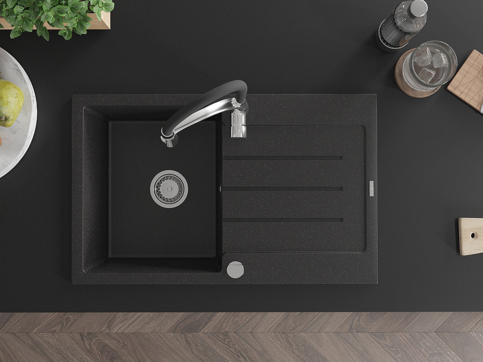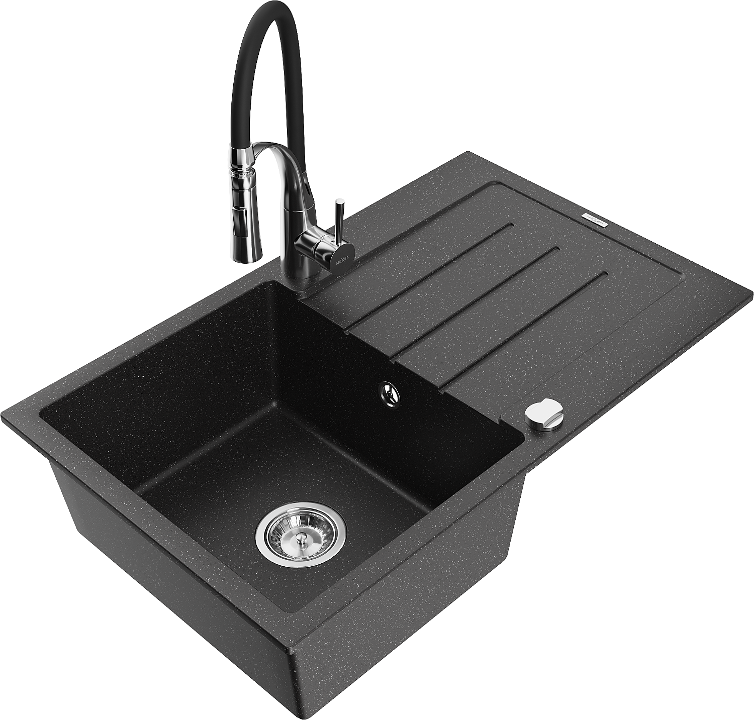 Mexen Bruno granitinė vienos kameros plautuvė su išdžiovintuvu ir virtuviniu maišytuvu Aster, juoda/sidabro metalo