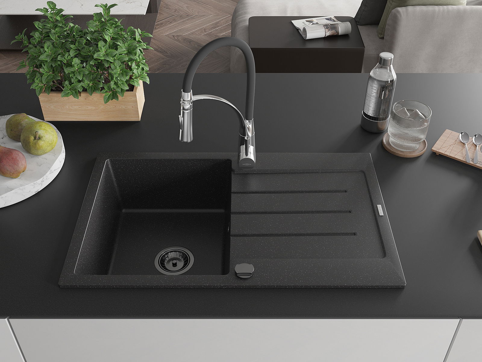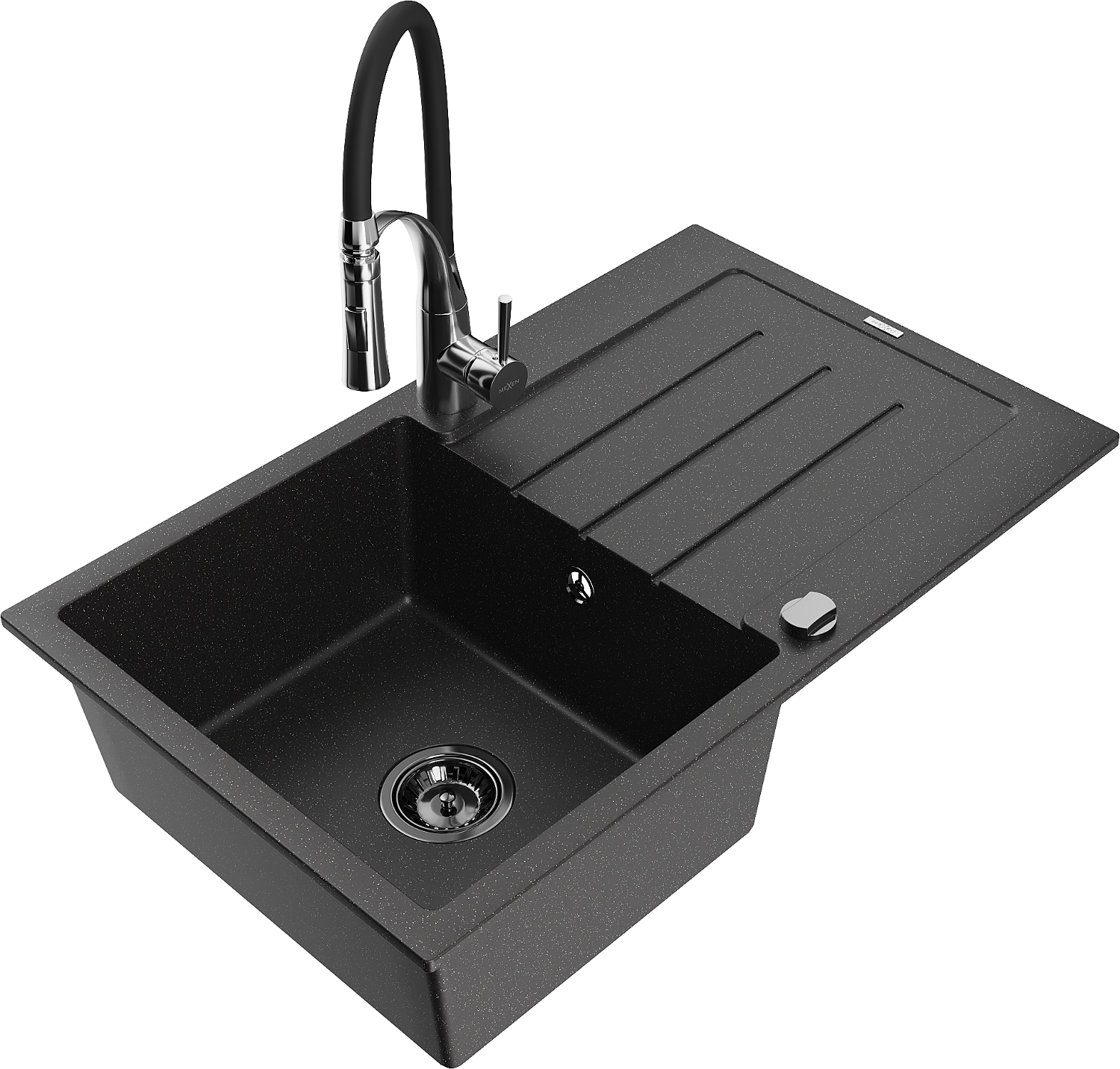 Mexen Bruno akmens masės virtuvės kriauklė su viena kamera, su nuvarvėjimu ir virtuviniu maišytuvu „Aster“,