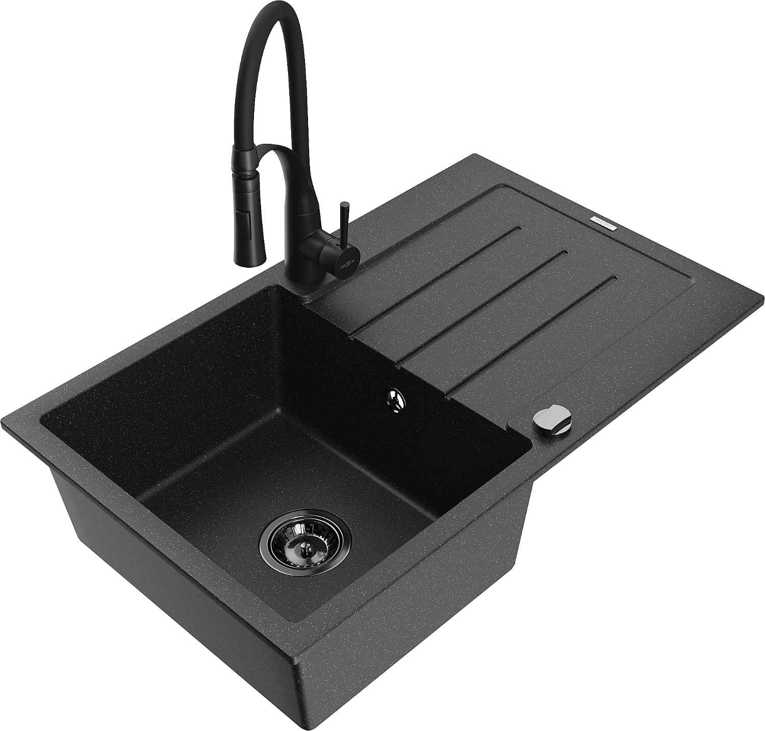 Mexen Bruno 1 skyriuas granitinė kriauklė su nutekamu ir virtuviniu maišytuvu Aster, juoda/sidabrinis metalikas
