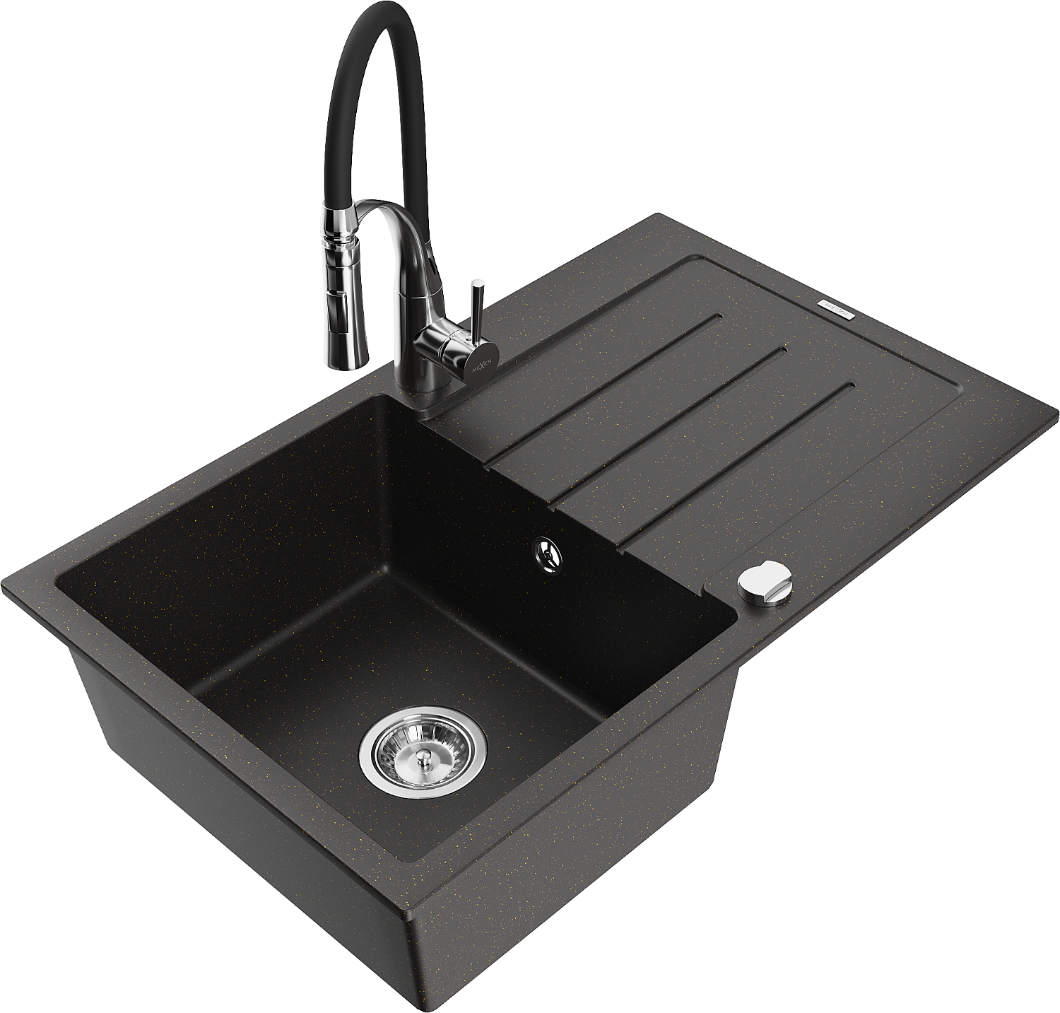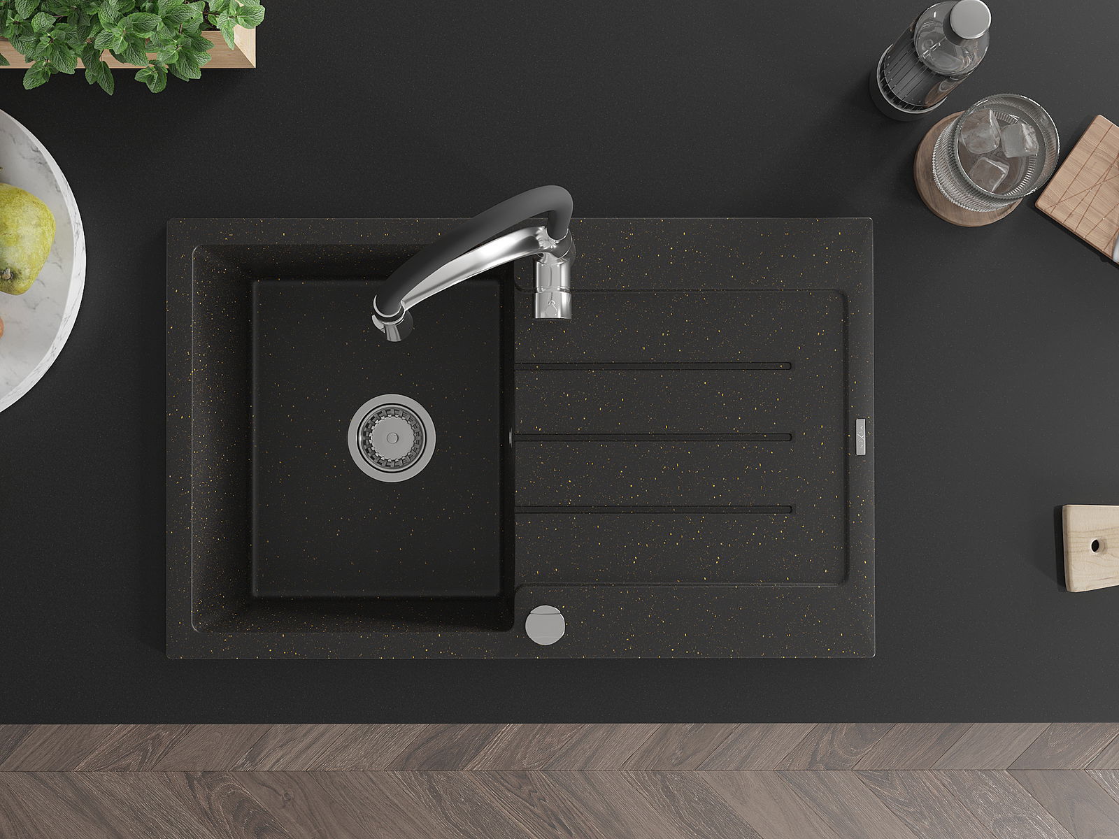 Mexen Bruno granitinė vienos kameros plautuvė su nutekėjimo zona ir virtuviu maišytuvu Aster, juoda/auksinės metalo spalvos