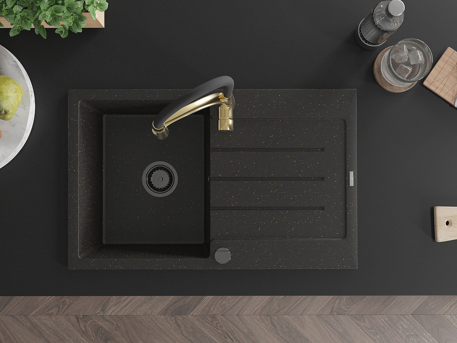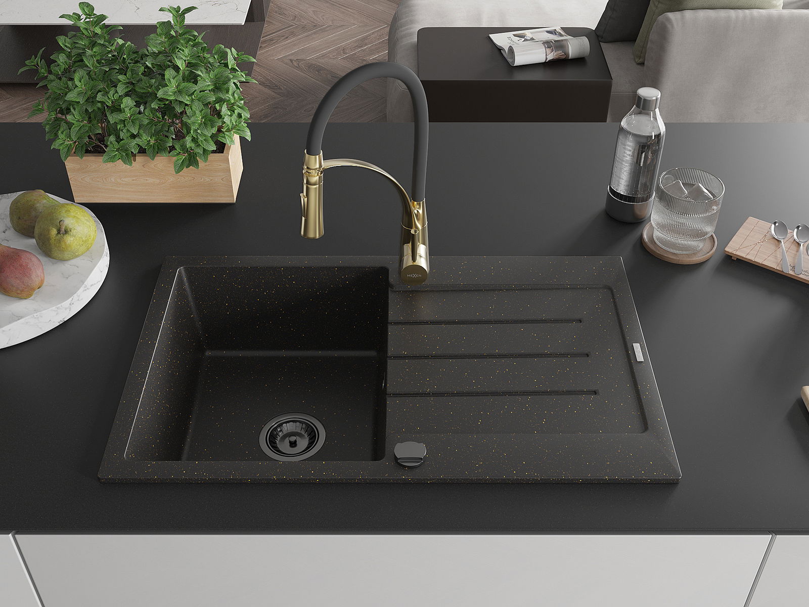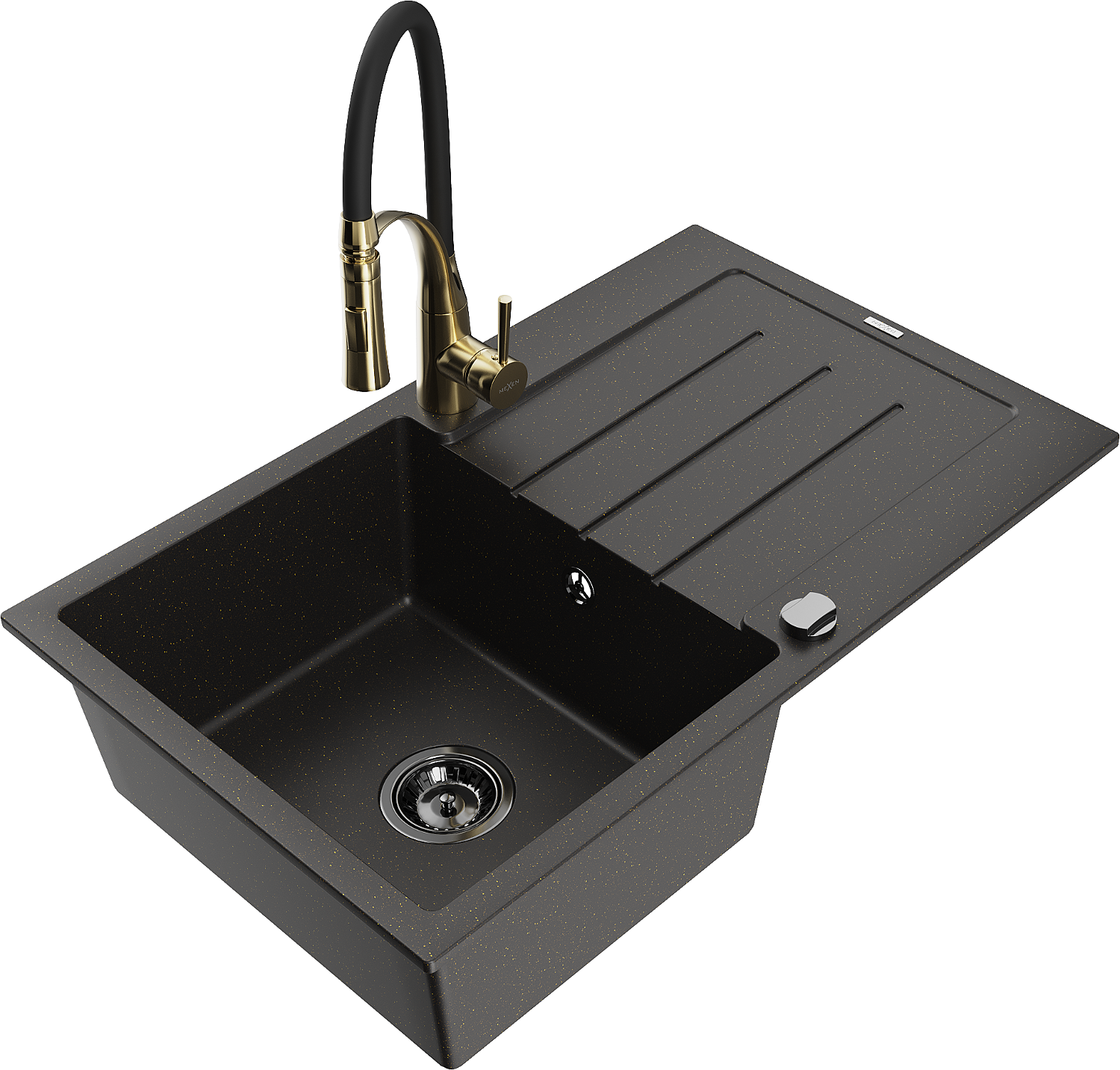 Mexen Bruno granitinė vienos kameros plautuvė su nutekėjimo zona ir virtuviniu maišytuvu Aster, juoda/auksinį metaliką
