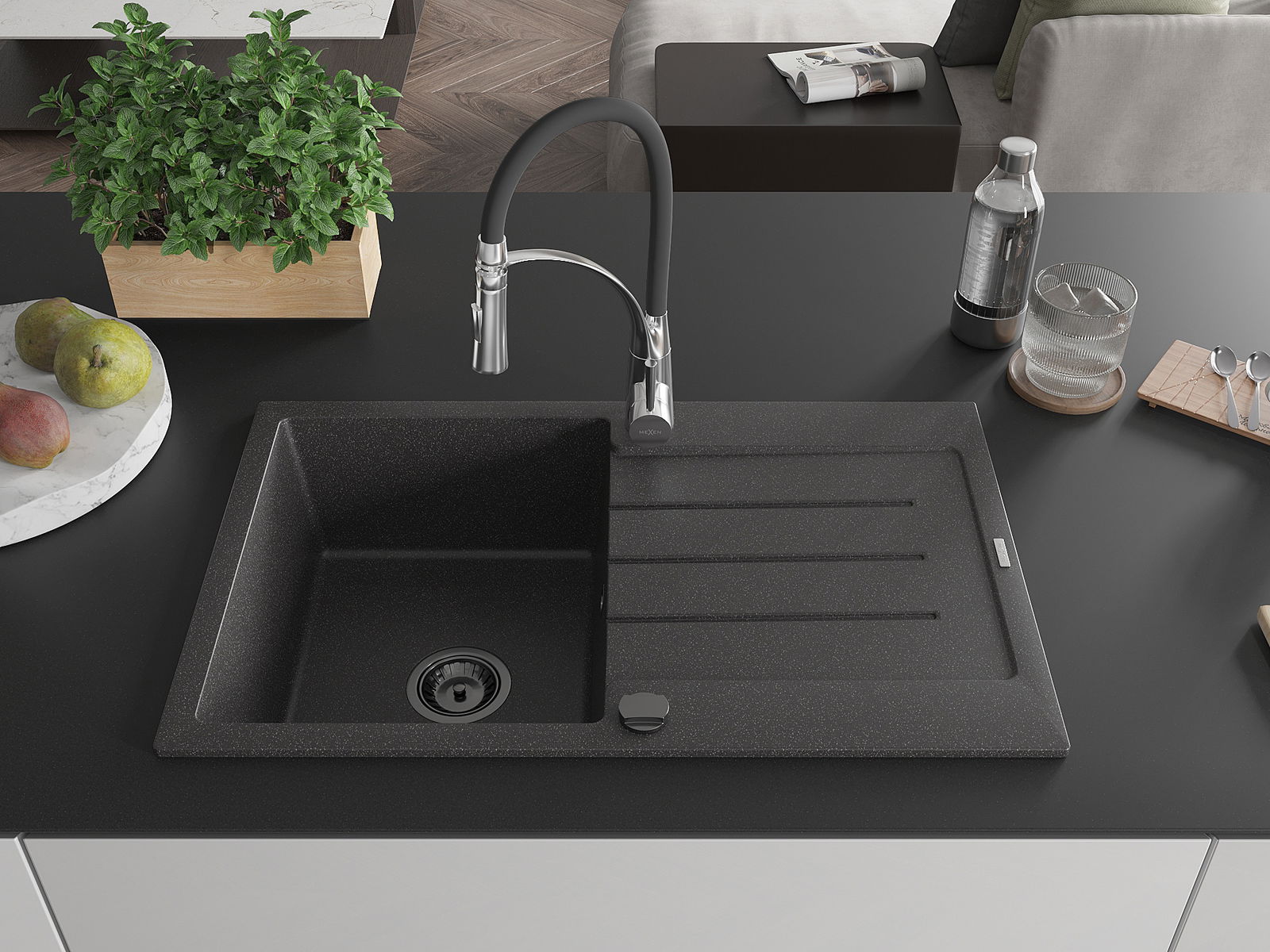 Mexen Bruno granitinė plautuvė vienos kameros su drenažu ir virtuviniu maišytuvu Aster, juoda su taškeliais