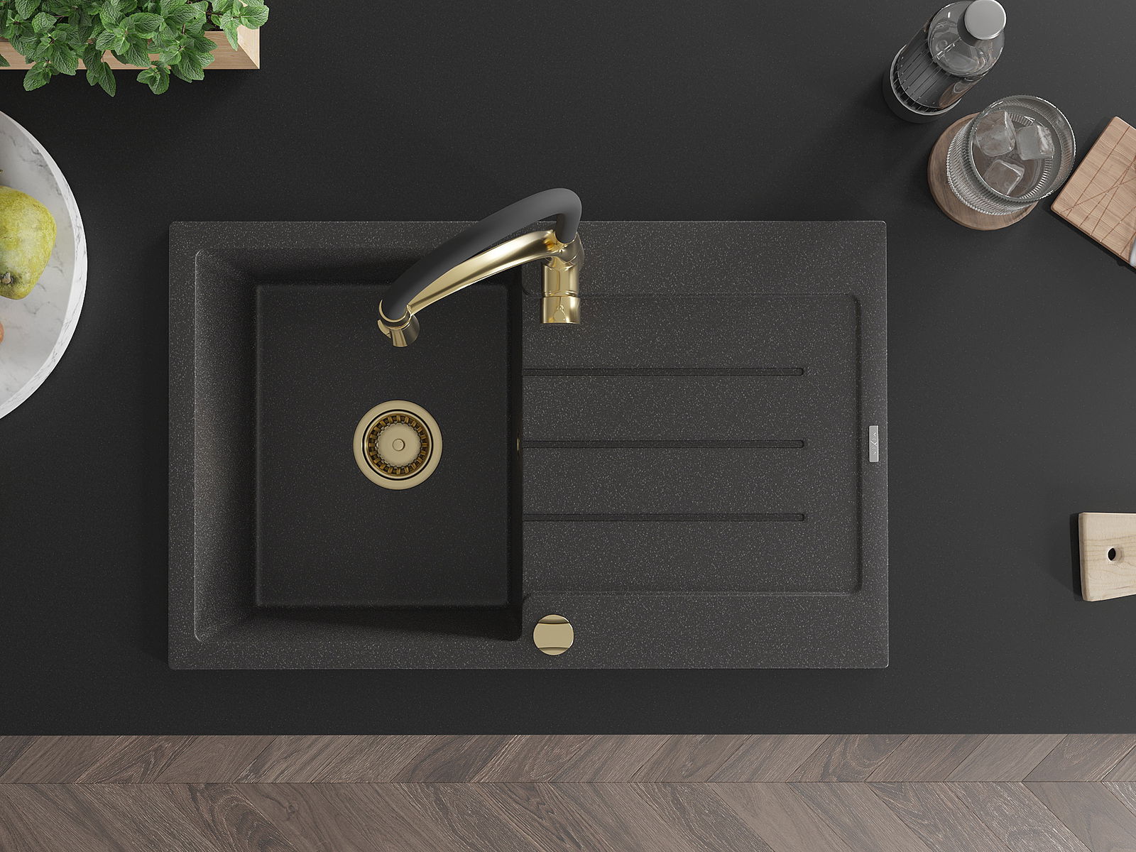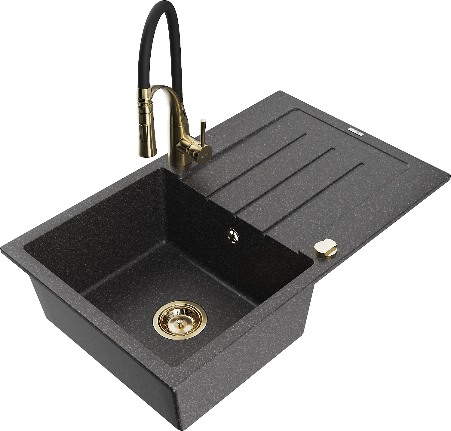 Mexen Bruno vienos plautuvės su nuvedimu ir virtuviniu maišytuvu Aster, juodas taškuotas - 6513-76-73450-57-G