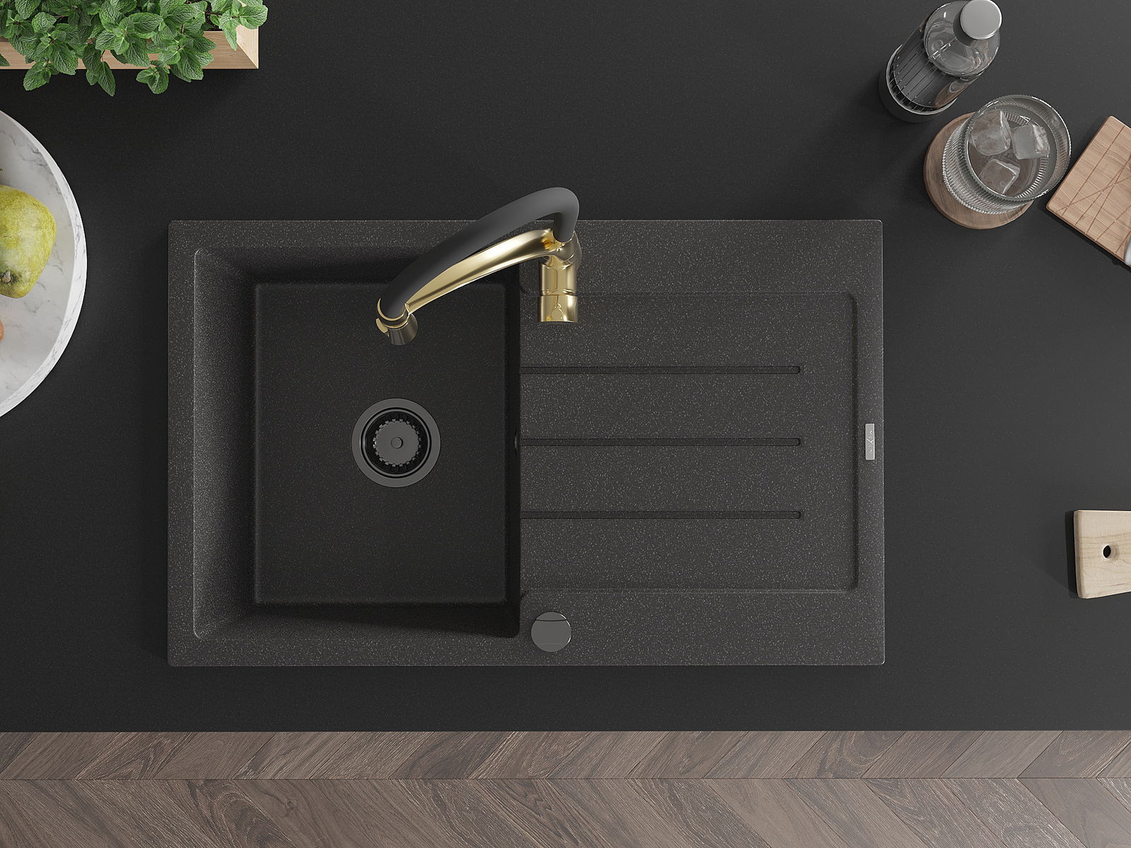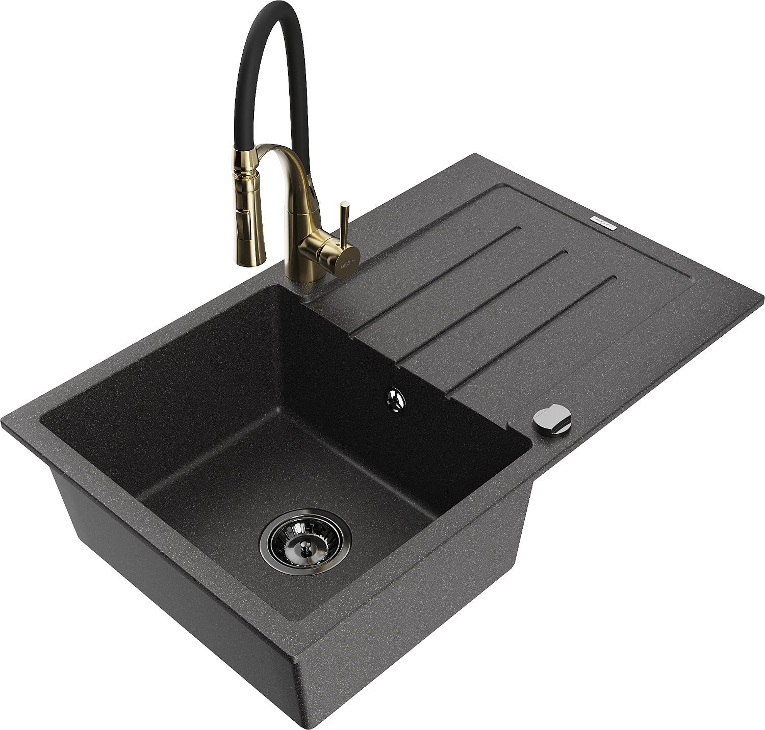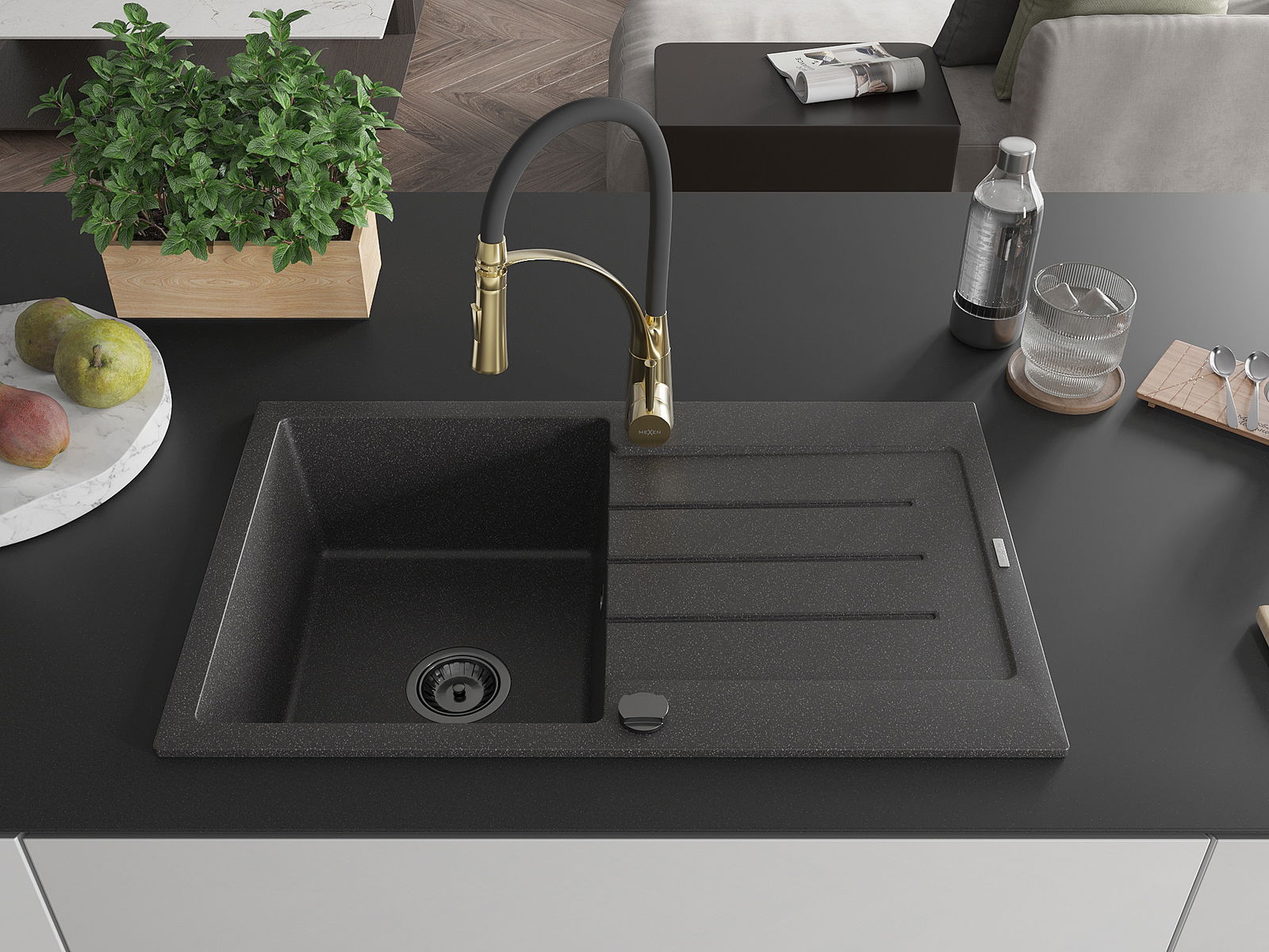 Mexen Bruno vienos kameros granitinė kriauklė su nutekamąja lentynėle ir virtuviniu maišytuvu Aster, juoda dėmėta