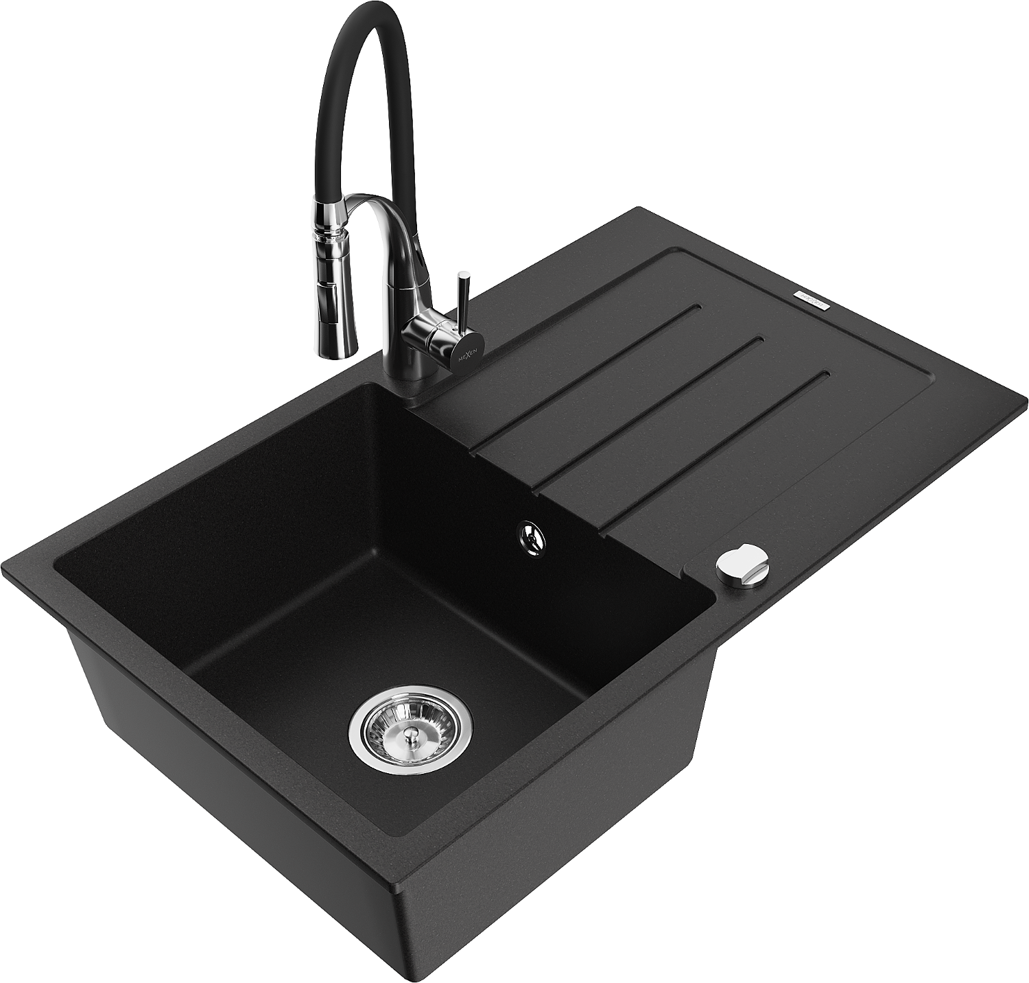 Mexen Bruno granitinė vienos kameros kriauklė su nusausinimo lentyna ir virtuvine maišytuve Aster, juoda - 6513-77-73450-07