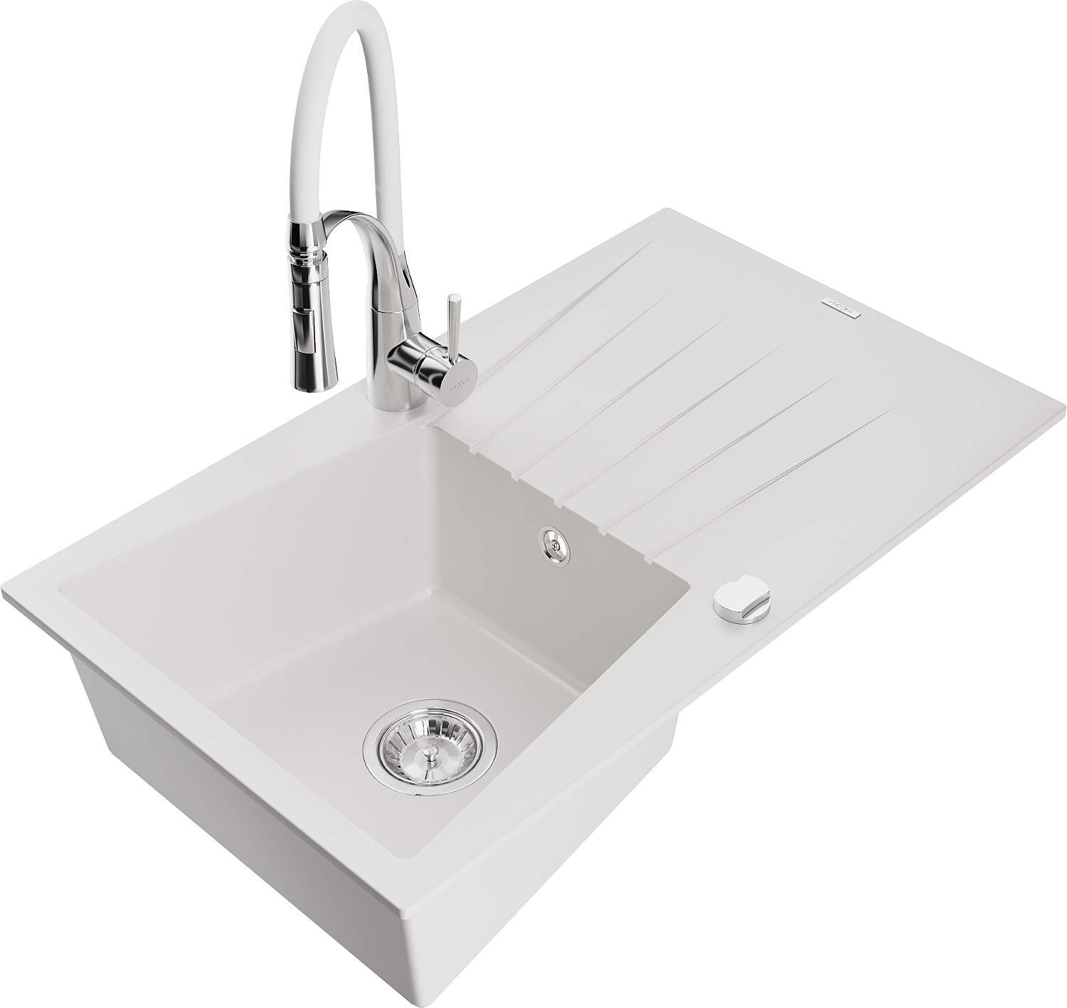 Mexen Cesar granitinė plautuvė su vienu dubeniu ir nusausintuvu bei virtuviniu maišytuvu Aster, balta - 6514-20-73450-02
