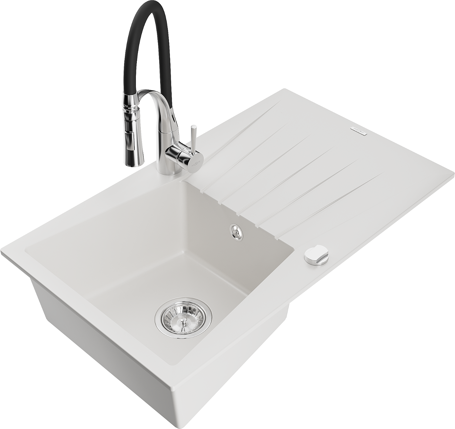 Mexen Cesar granito plautuvė su viena kamera ir nusausintuvu bei virtuvės maišytuvu Aster, baltas - 6514-20-73450-07