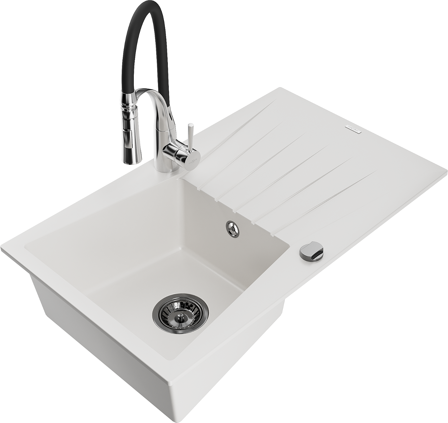 Mexen Cesar granito plautuvė su 1 skyriumi ir nutekėjimu bei virtuviniu maišytuvu Aster, baltas - 6514-20-73450-07-B