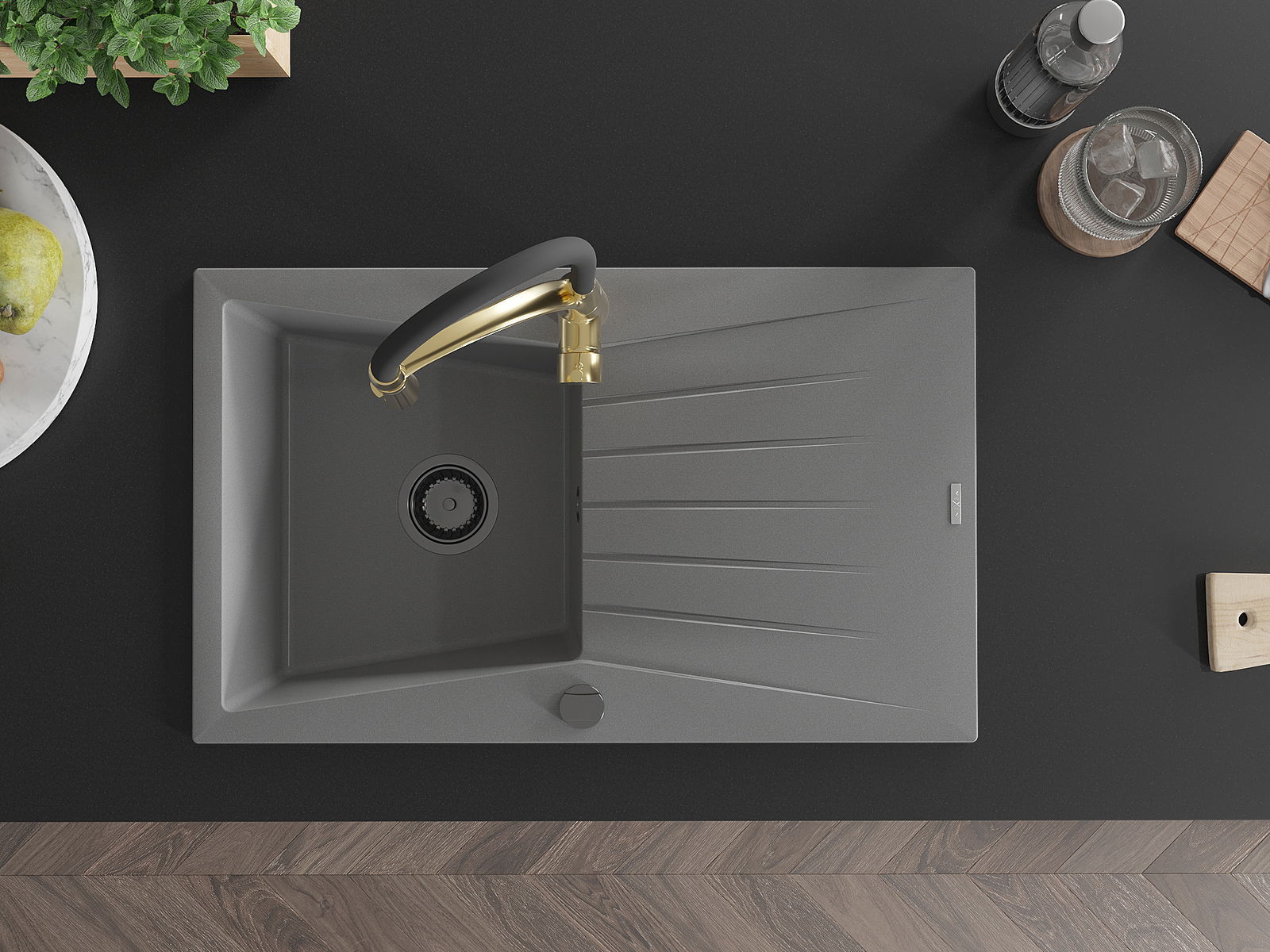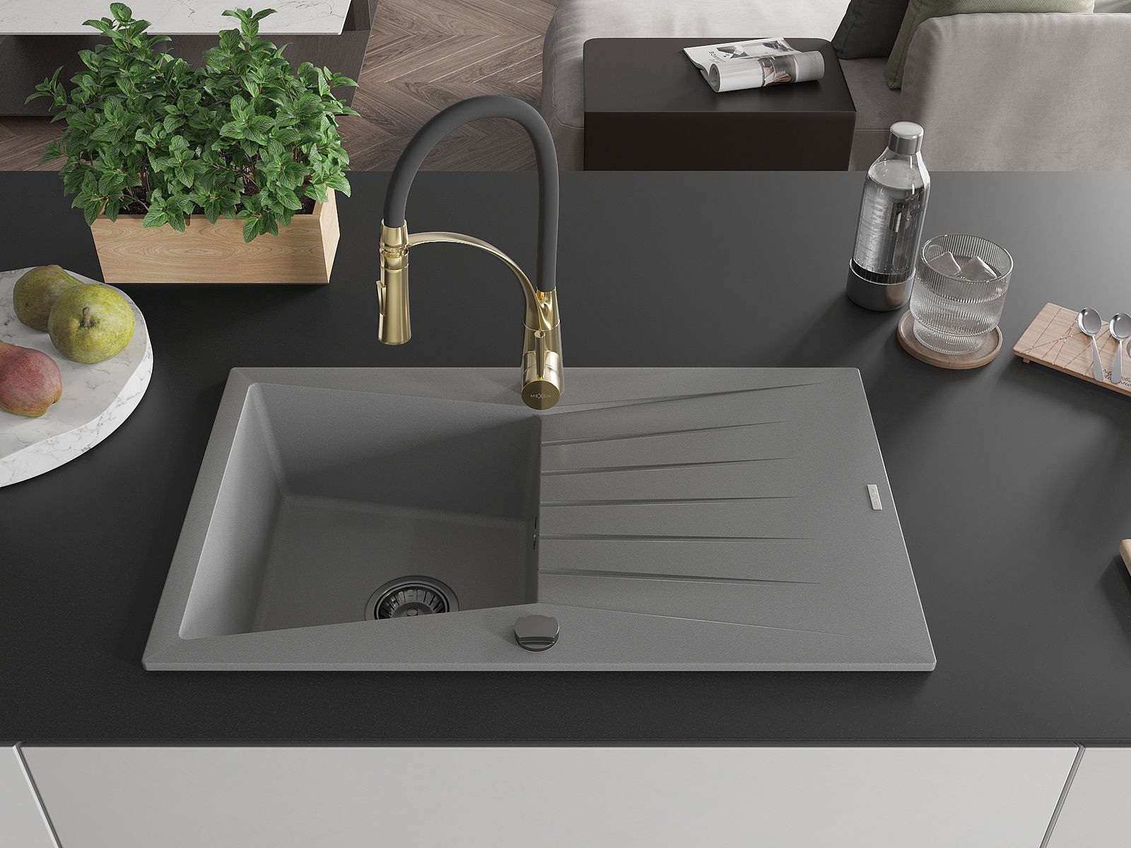 Mexen Cesar vienos kameros granito plautuvė su nutekėjimo zona ir virtuviniu maišytuvu Aster, pilka - 6514-71-73450-57-B