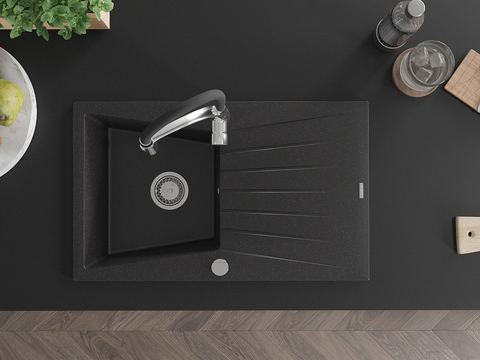 Mexen Cesar granitinis kriauklė 1-durų su drenažu ir virtuviniu maišytuvu Aster, juodas/sidabro metalo - 6514-73-73450-07