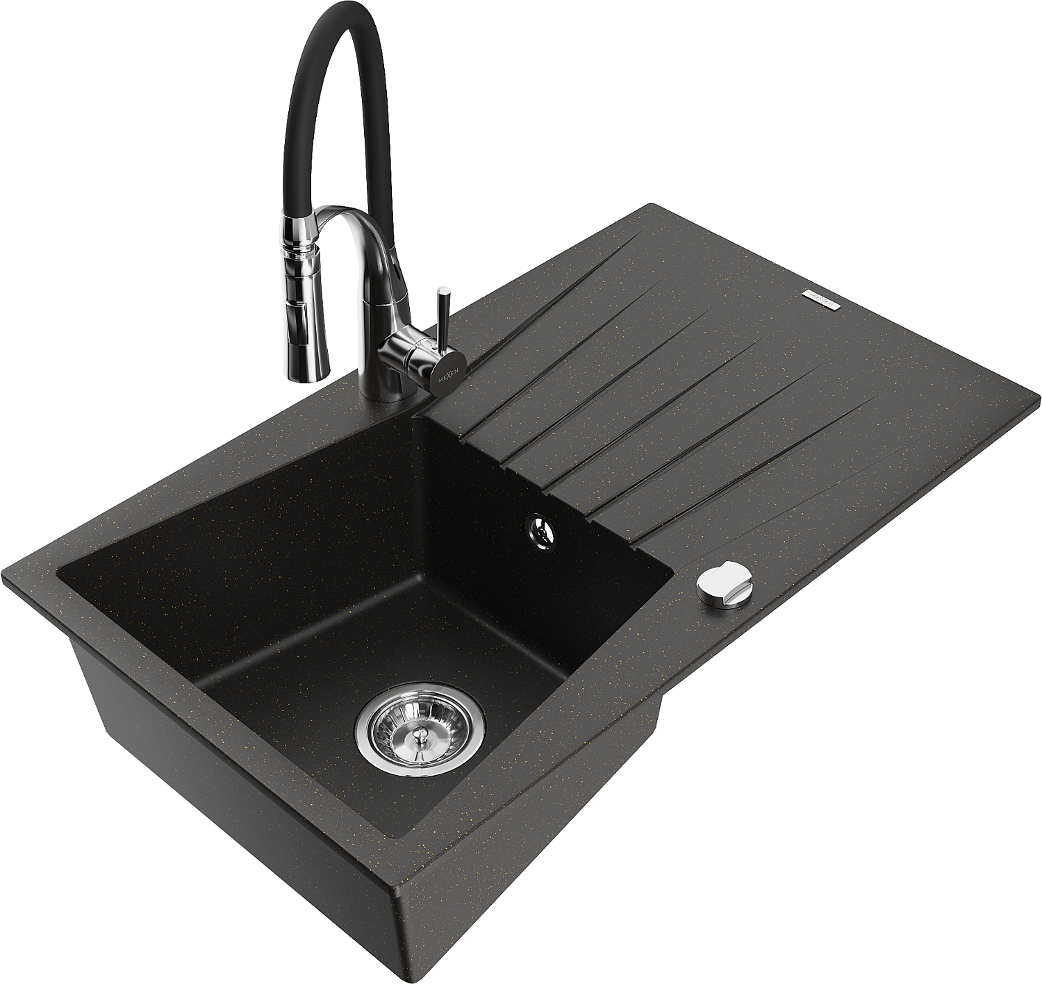 Mexen Cesar granitinė kriauklė 1 skyrelio su nutekėjimo zona ir virtuvės čiaupu Aster, juoda/auksinė metalika - 6514-75-73450-0?