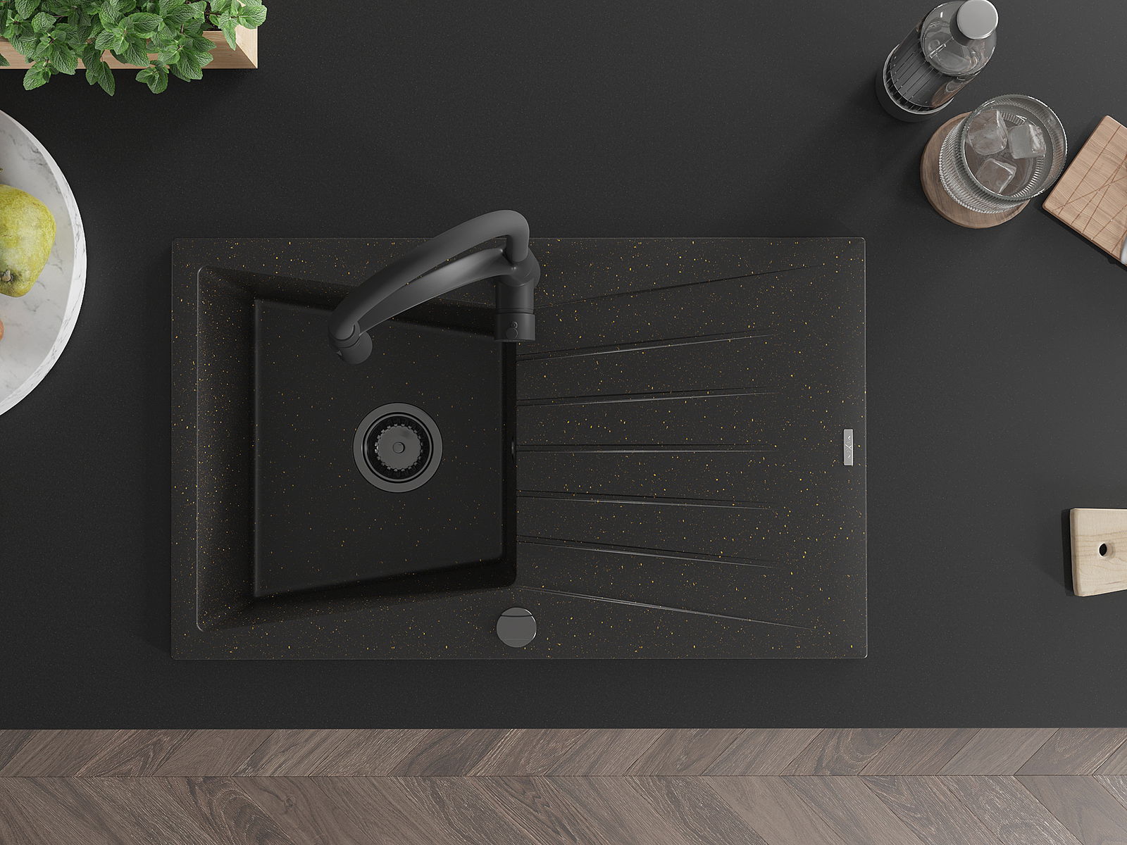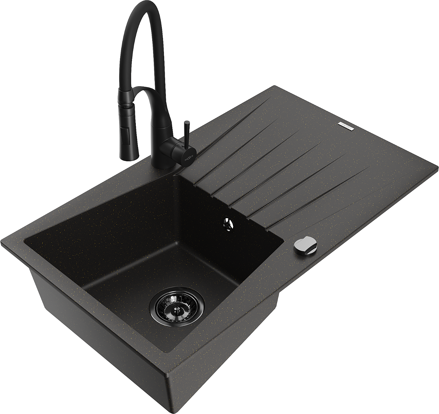 Mexen Cesar 1 kamerų granitinė virtuvės kriauklė su nusausintuvu ir Aster maišytuvu, juoda/auksinė metalik