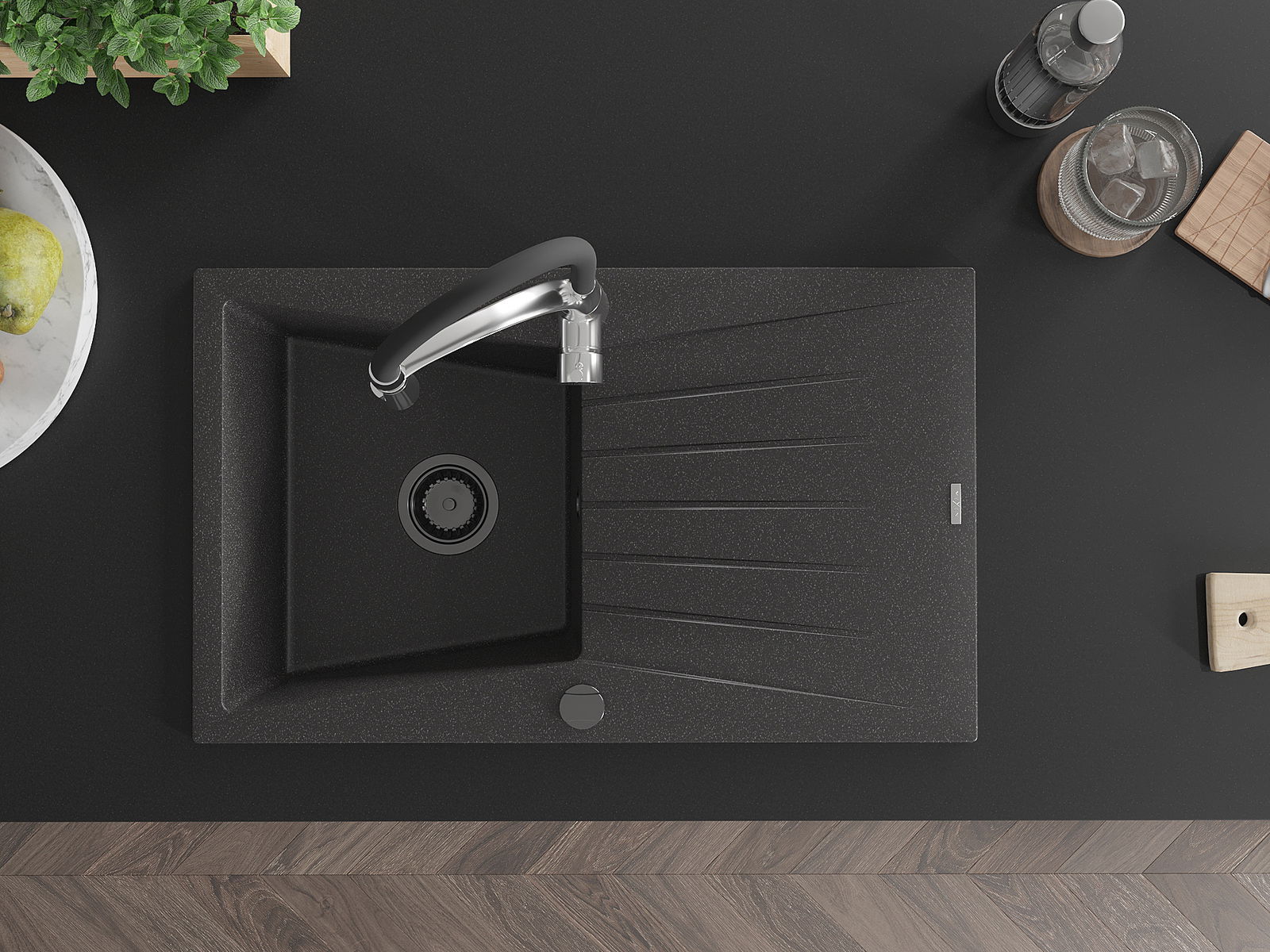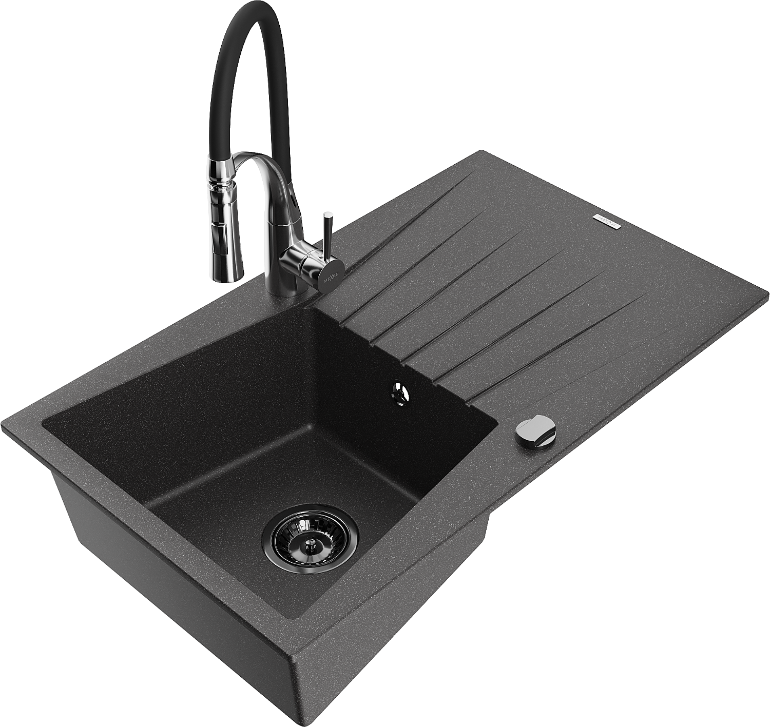 Mexen Cesar granitinė vienos kameros plautuvė su lašėjimo padėklu ir virtuviniu maišytuvu Aster, juoda su dėmėmis