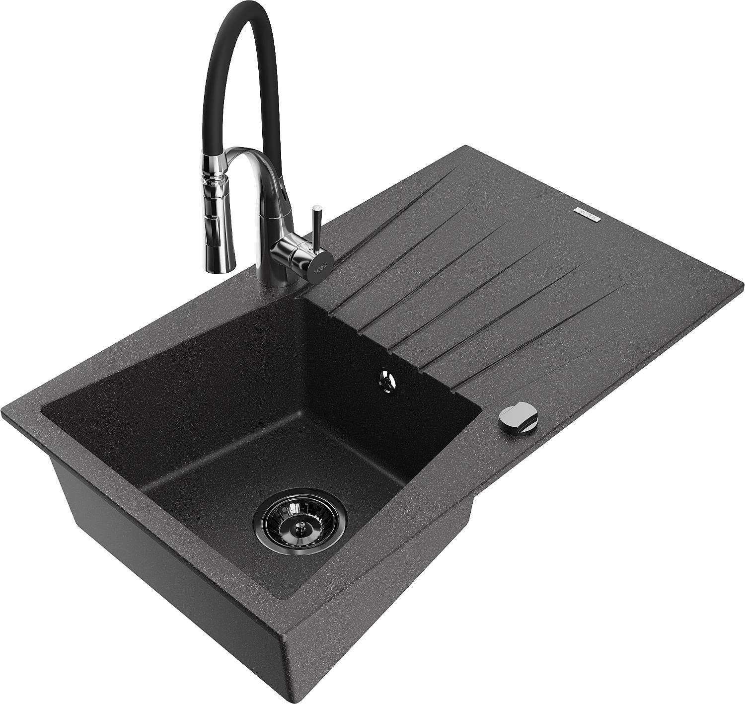 Mexen Cesar vienos kameros granito kriauklė su džiovykla ir virtuviniu maišytuvu Aster, juoda su taškeliais - 6514-76-73450-07-?
