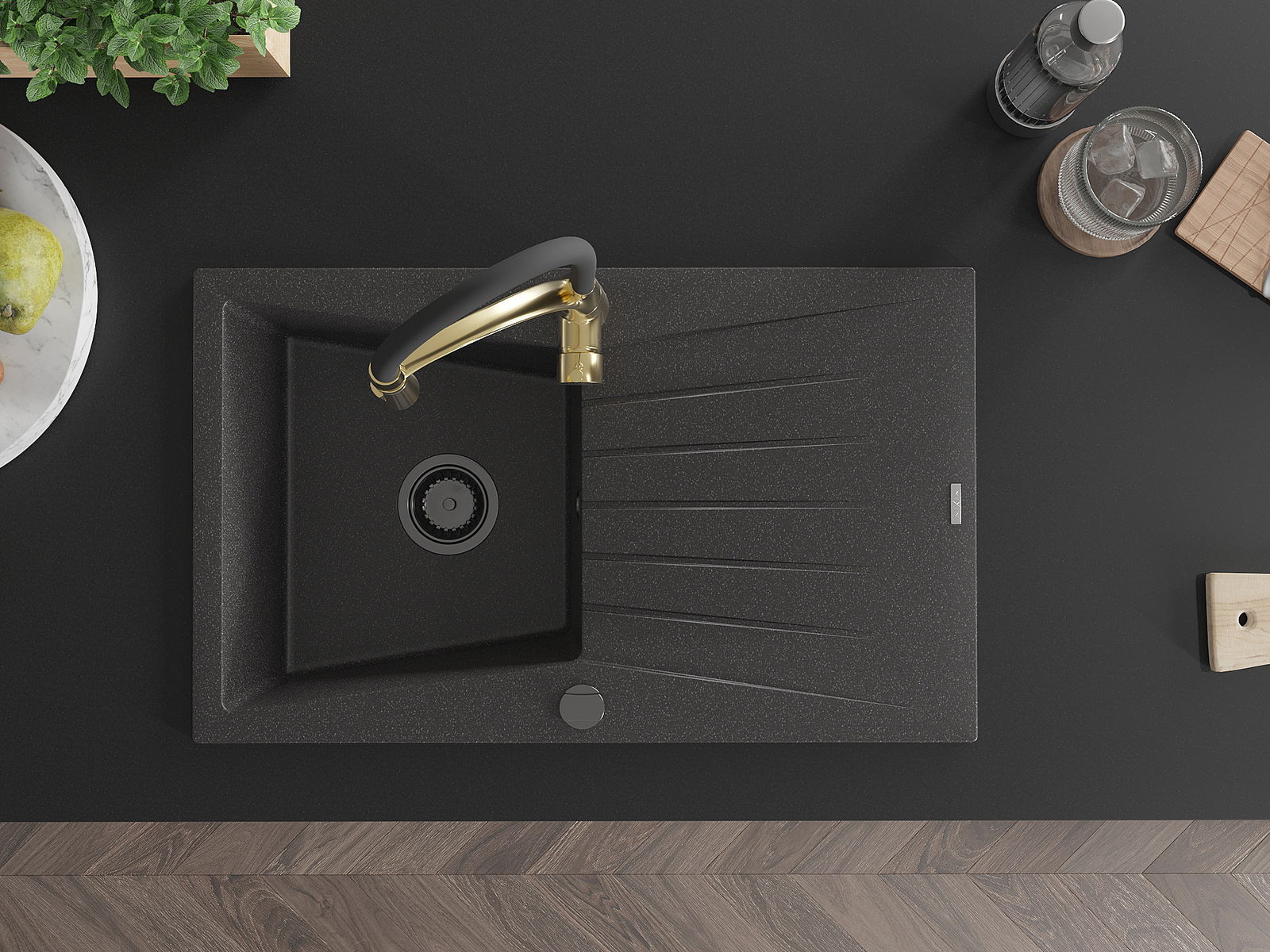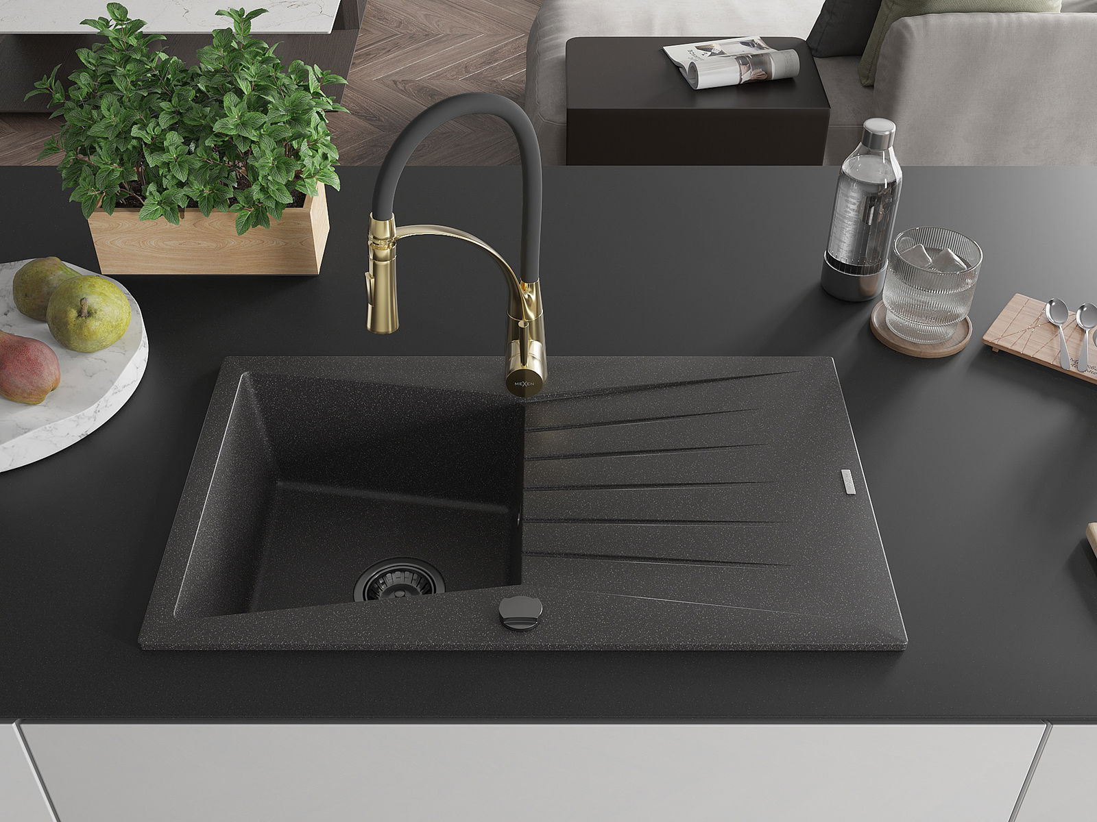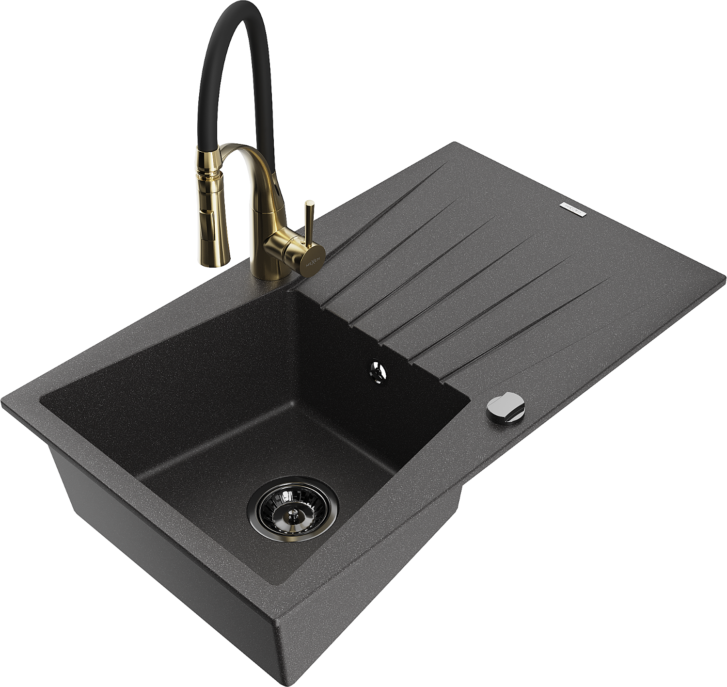 Mexen Cesar granitinė vieno dubens plautuvė su nusausintuvu ir virtuviniu maišytuvu Aster, juodas dėmėtas