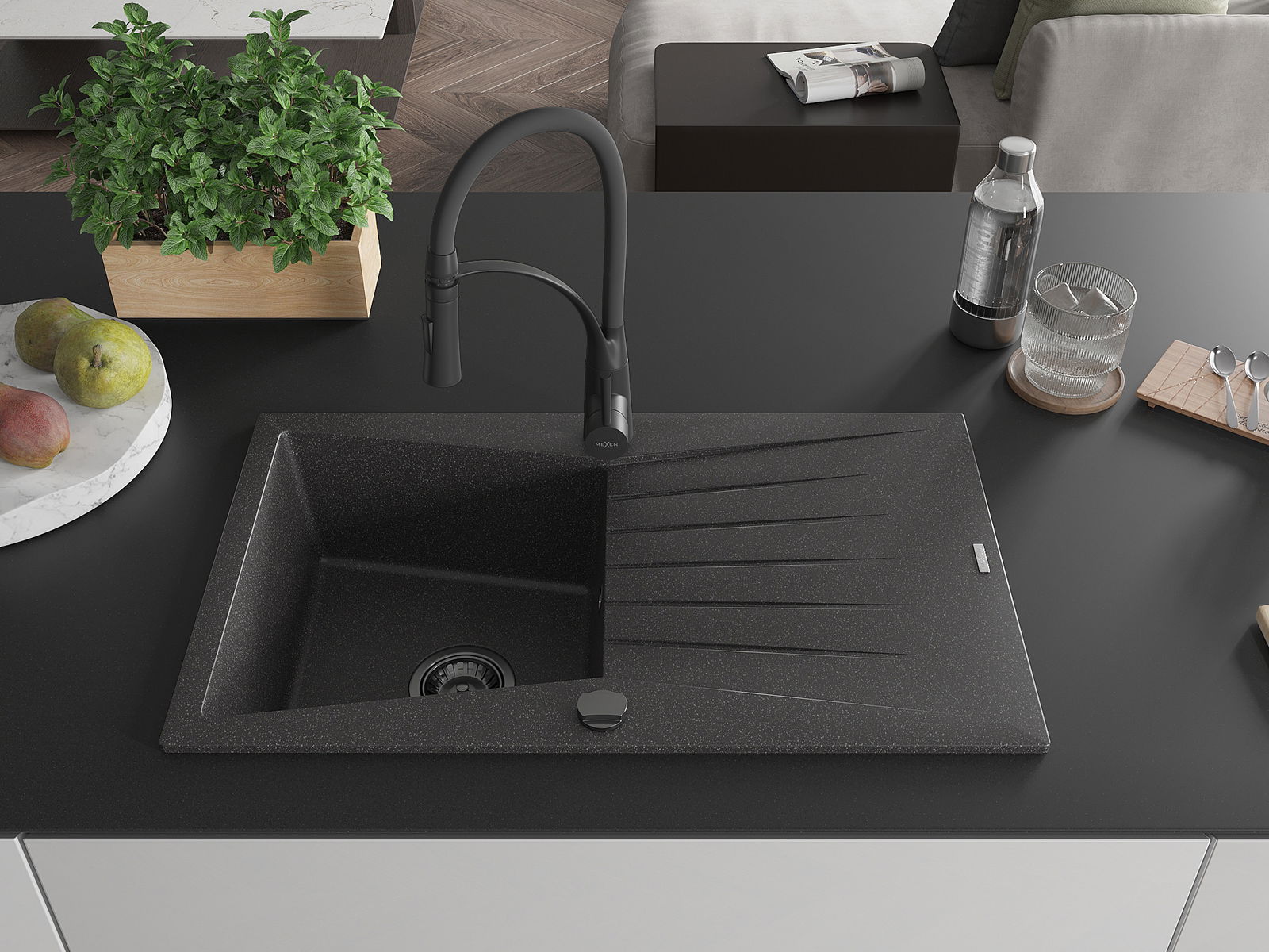 Mexen Cesar granito plautuvė su viena kamera ir nutekamuoju paviršiumi bei virtuviniu maišytuvu Aster, juodas dėmėtas - 6514-76?