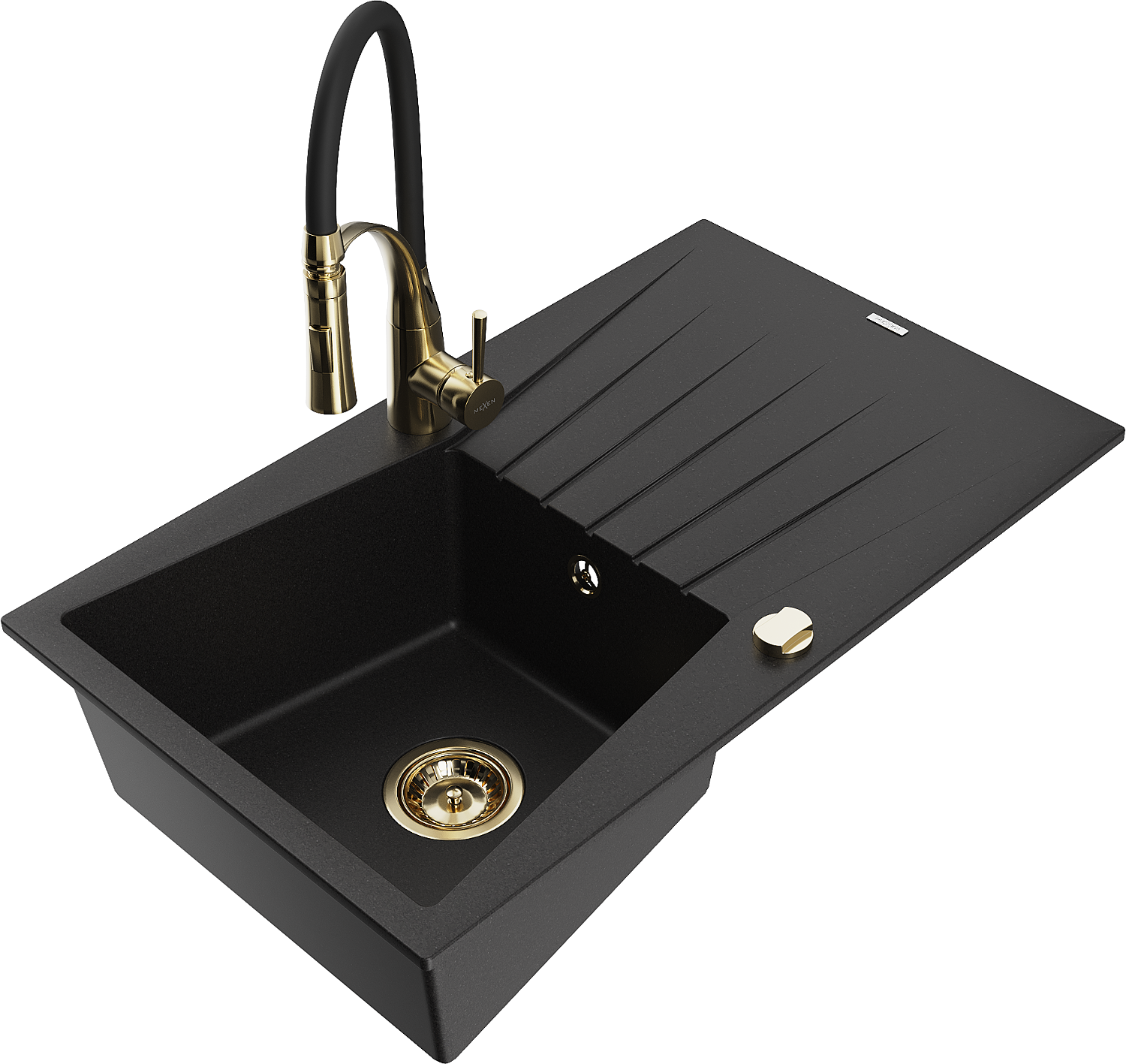 Mexen Cesar vienos kameros granitinė plautuvė su nutekamu ir virtuviniu maišytuvu Aster, juoda - 6514-77-73450-57-G
