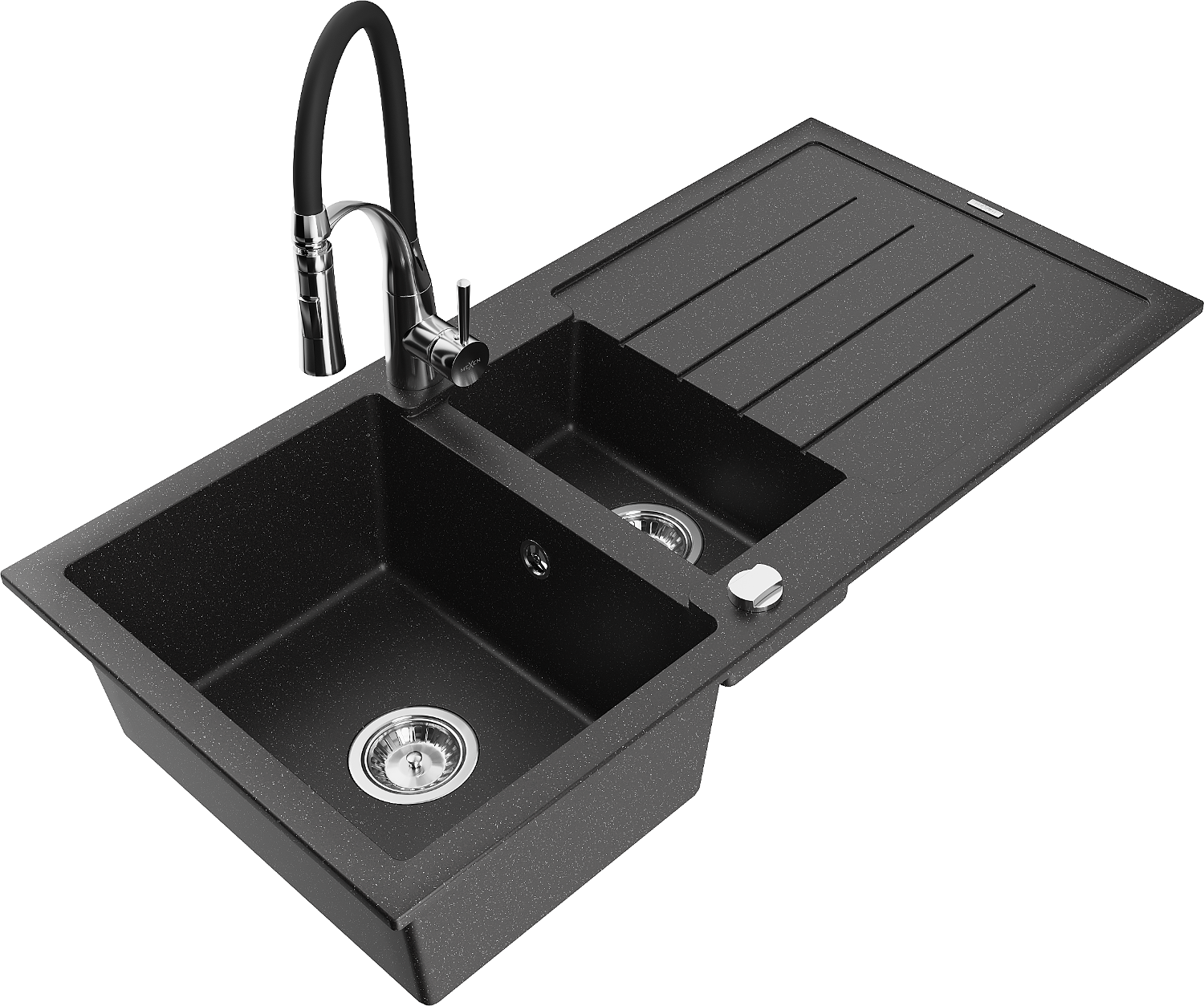 Mexen Andres granitinė 1,5 kamerų plautuvė su nusausintuvu ir virtuvės maišytuvu Aster, juoda/sidabrinė metalika