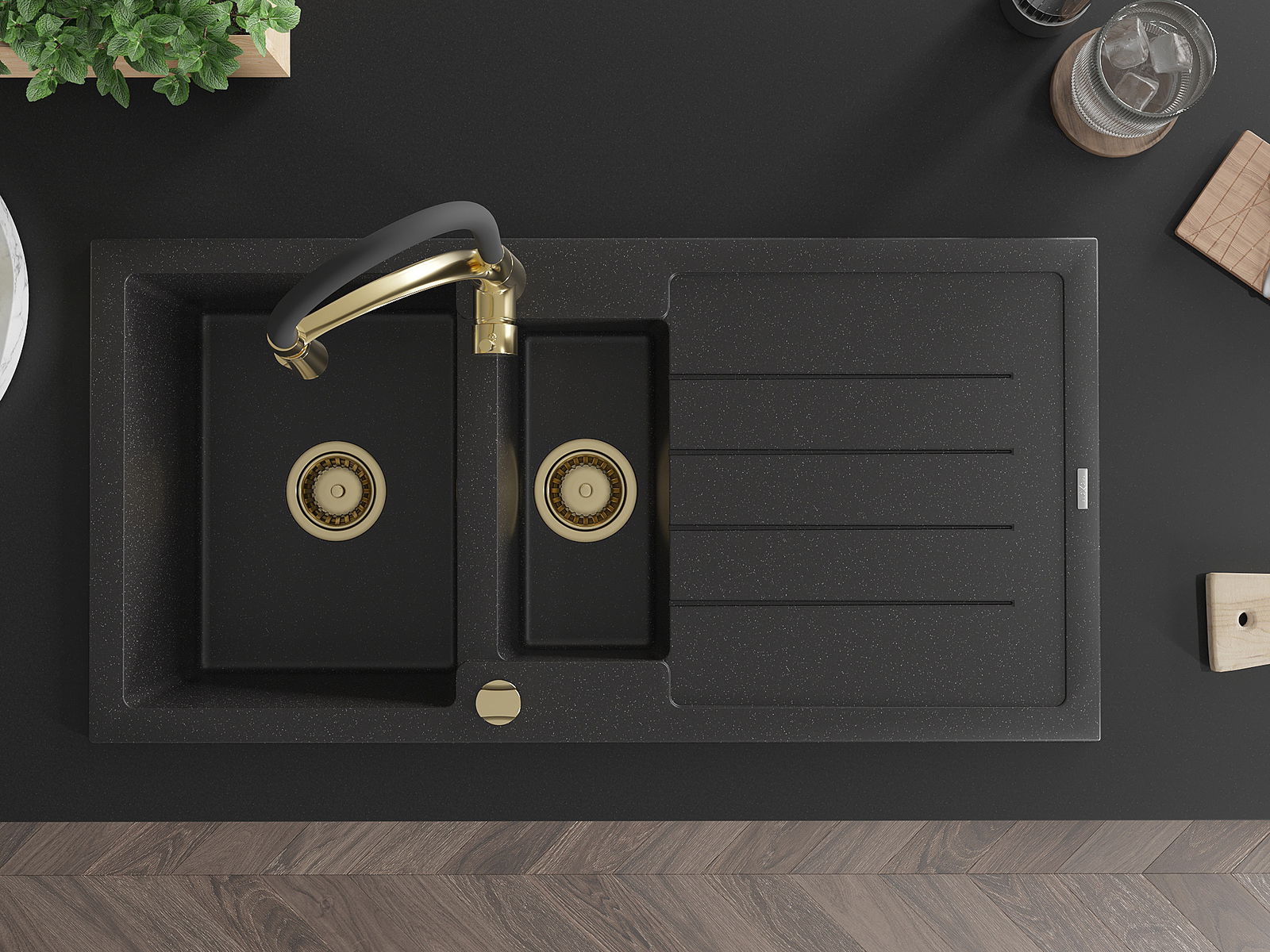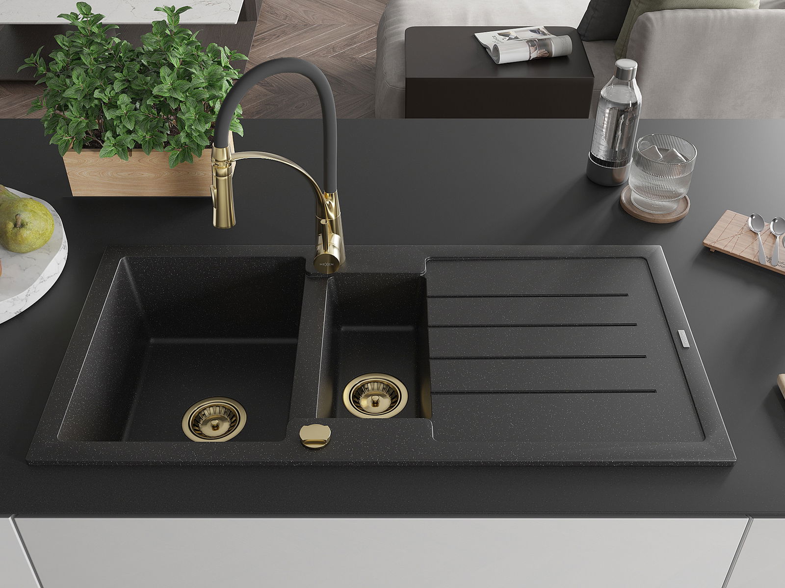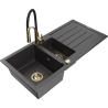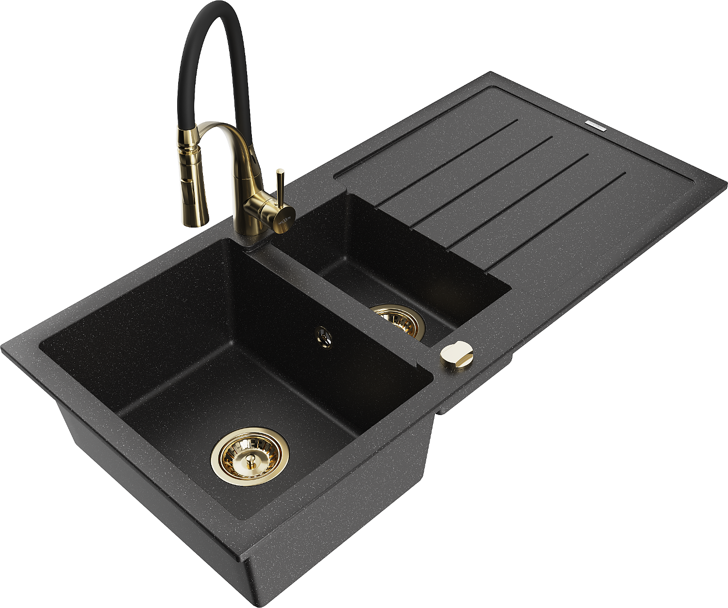 Mexen Andres 1,5 kamerų granitinė virtuvės kriauklė su drenažu ir maišytuvu „Aster“, juoda/sidabrinė