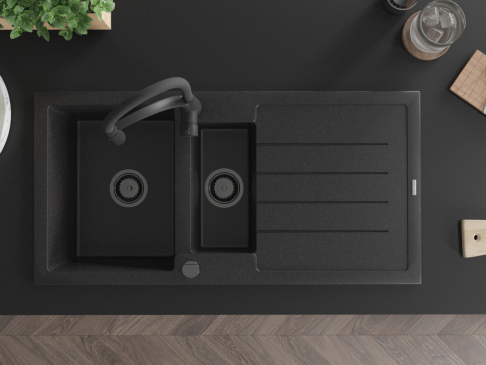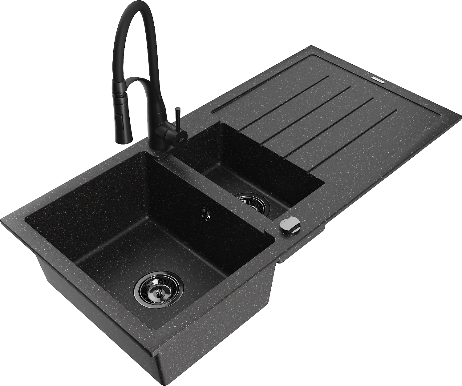 Mexen Andres granitinė 1,5 kamerų kriauklė su nusausintuvu ir virtuviniu maišytuvu Aster, juoda/sidabrinė
