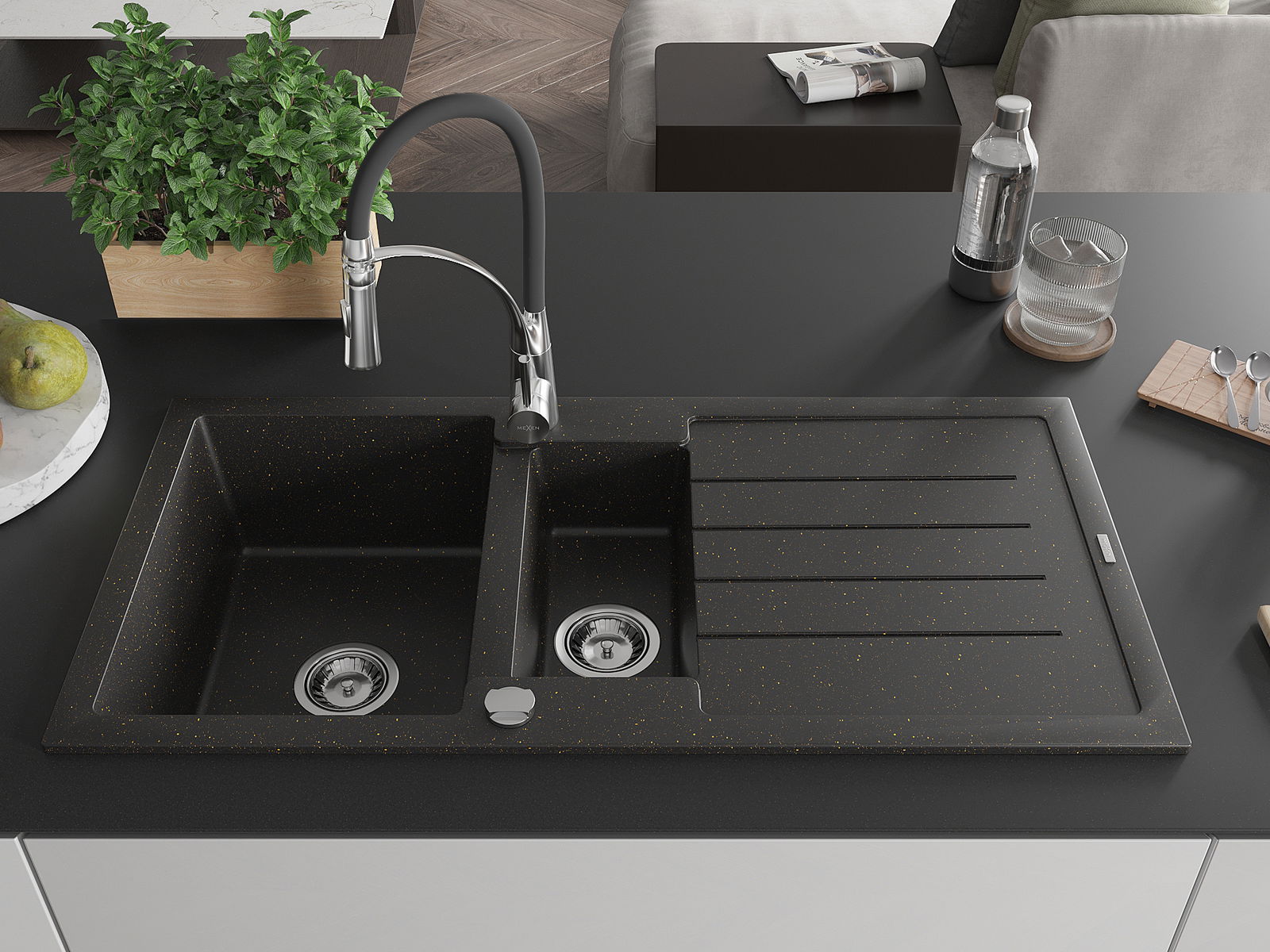 Mexen Andres granitinis plautuvės 1,5-ių dalių su indų drenažu ir virtuvinis maišytuvas Aster, juodas/auksinis metalikas - 6515?