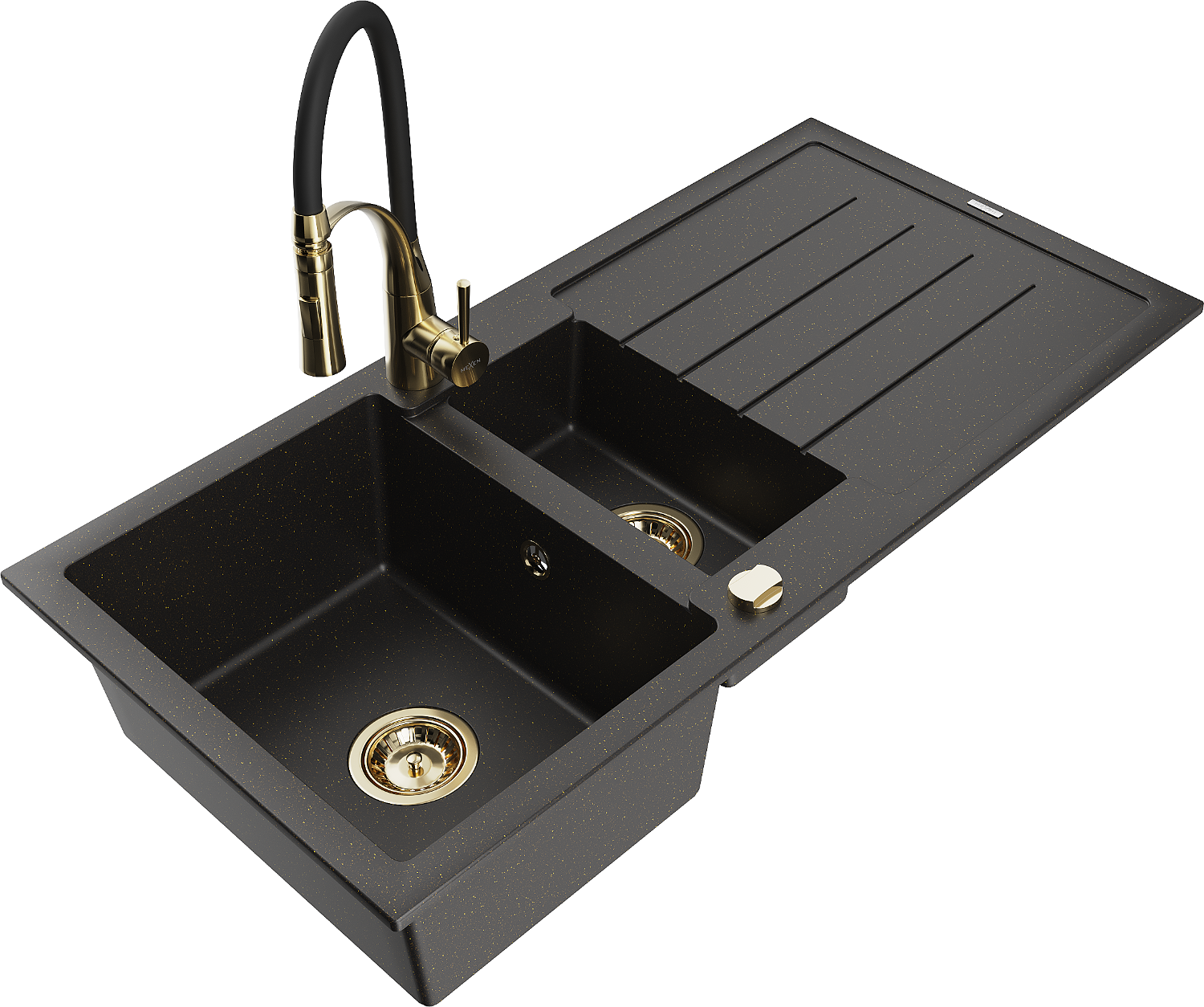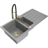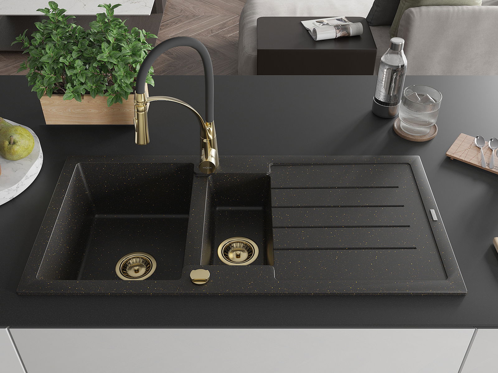 Mexen Andres granitinė plautuvė su 1,5 dubeniu, nutekėjimu ir virtuviniu maišytuvu Aster, juodas/auksinis metalikas